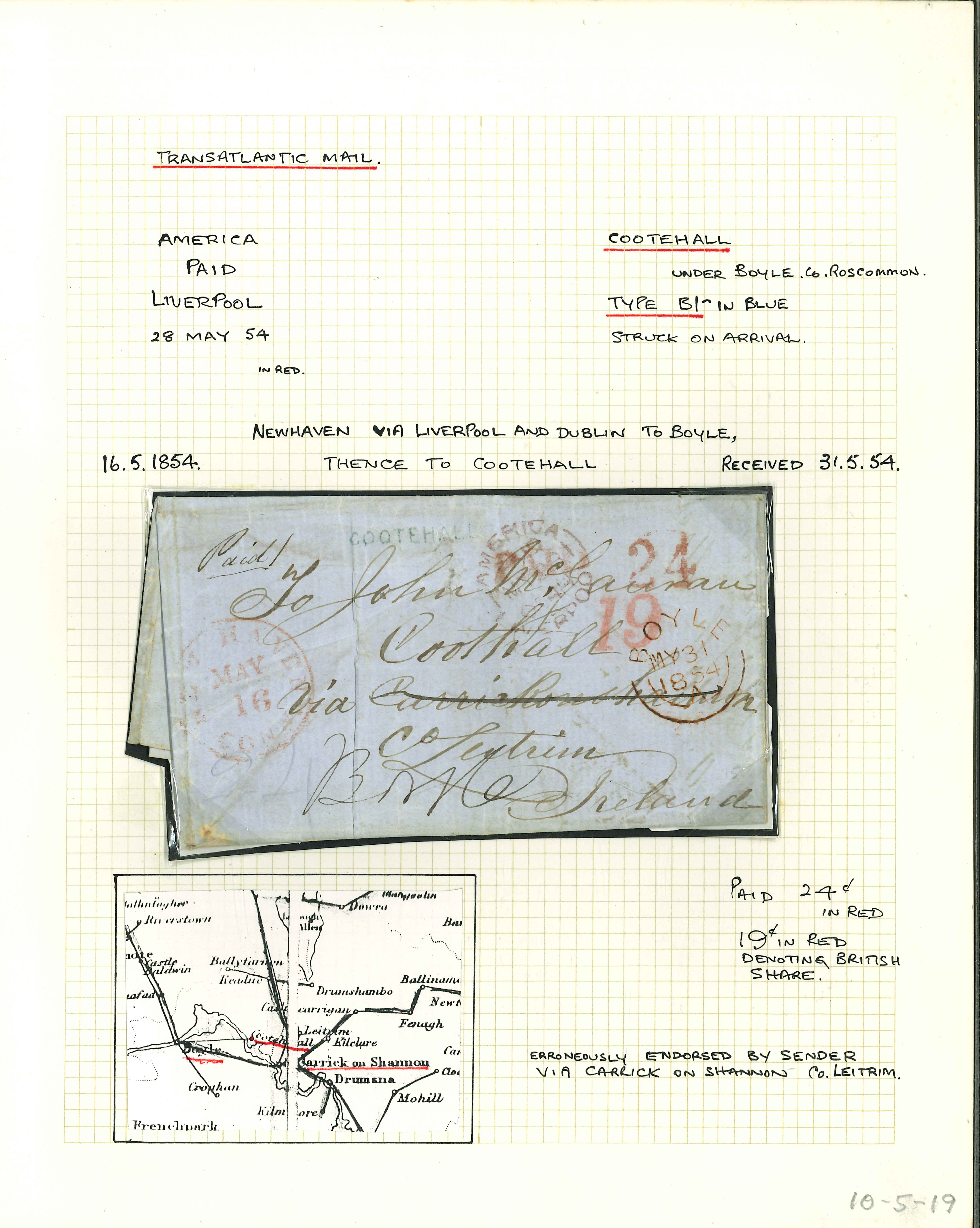 Roscommon - Cootehall: 1854 Folded entire from New York to Cootehall, erroneously addressed by the sender "via Carrick on Shannon, Co. Leitrim", showing a fine array of rate mkgs in the form of "19" and "24" cents in red, plus New Haven,