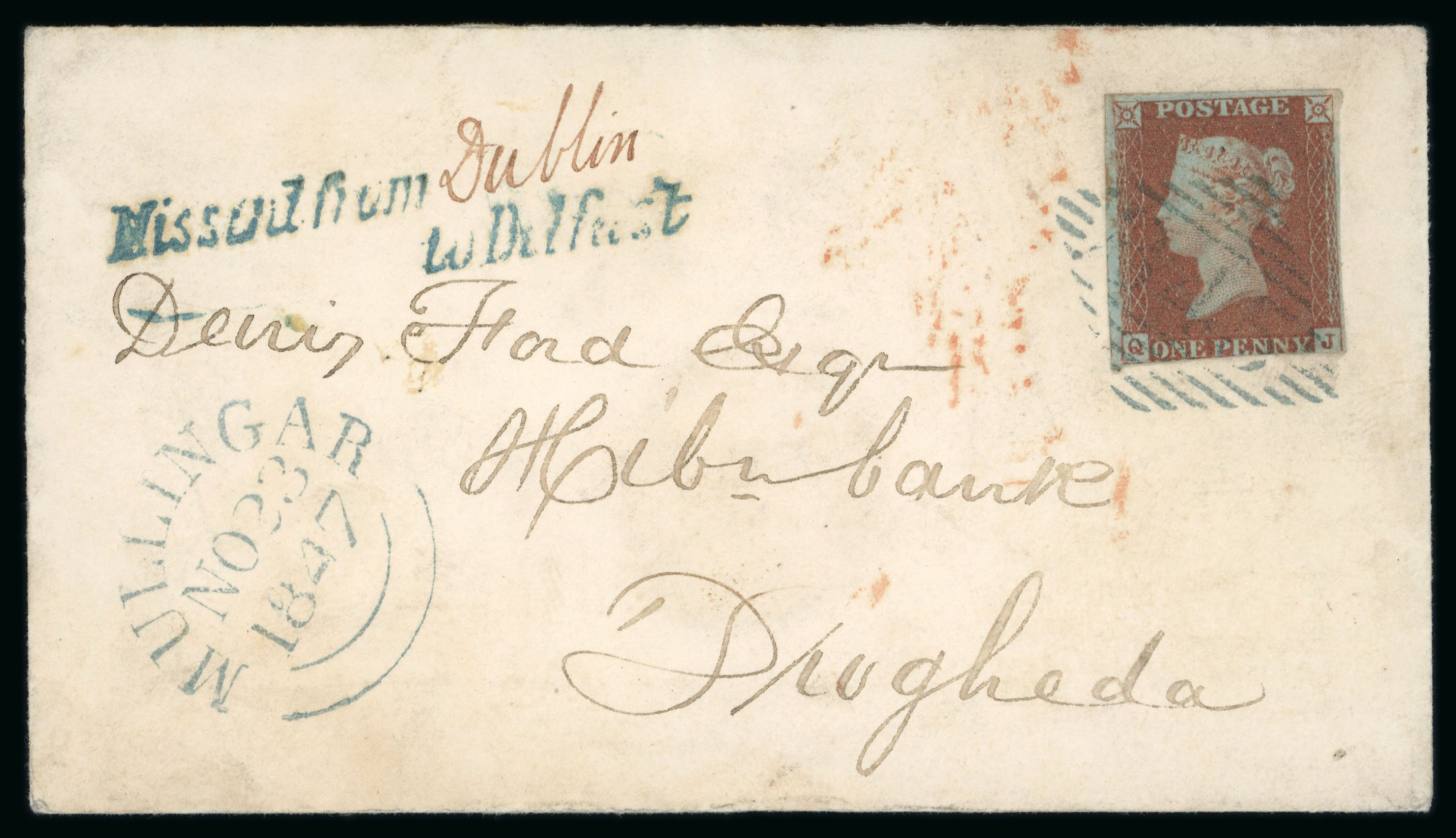 Westmeath - Mullingar: 1847 (23.11) Envelope from Mullingar to Drogheda, franked 1841 1d red tied by green "345" diamond with MULLINGAR/NO.23.1847 cds alongside, plus a scarce example of the italic and manuscript Missent from (Dublin)/to