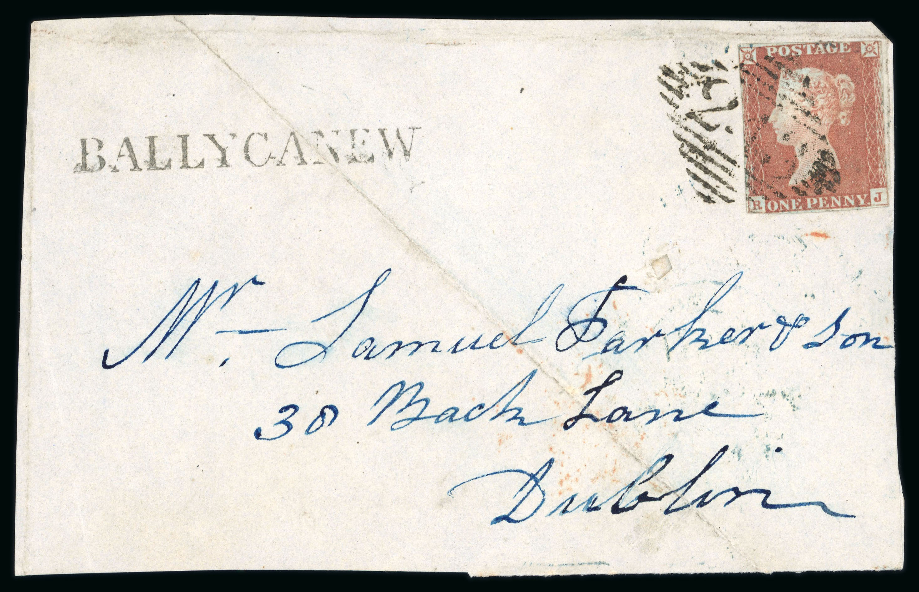 black, italic Athboy/Penny Post in blue, boxed PAID A/ATHBOY in blue (2), 2-line BETTYSTOWN/R,H in black and blue, 2-line italic Castletown R.H./Navan in blue (2) etc., all strikes are fair to very fine, a scarce group (40) (Image 1)