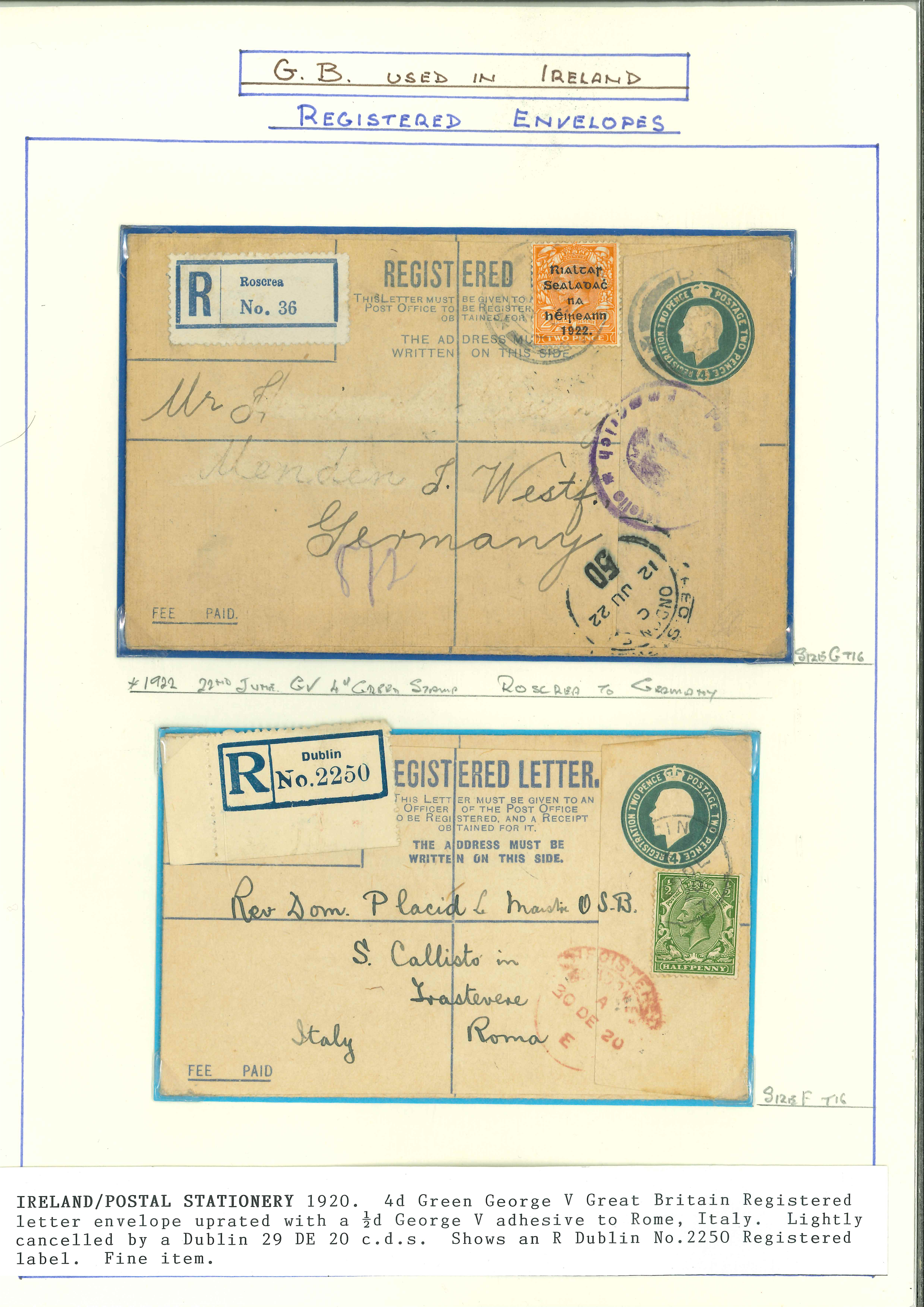 1874–1922 Registered Envelopes Used in Ireland. An attractive and carefully mounted assembly of over 125 registered envelopes, neatly written up on album pages. The collection displays an extensive range of sizes and types, including Size
