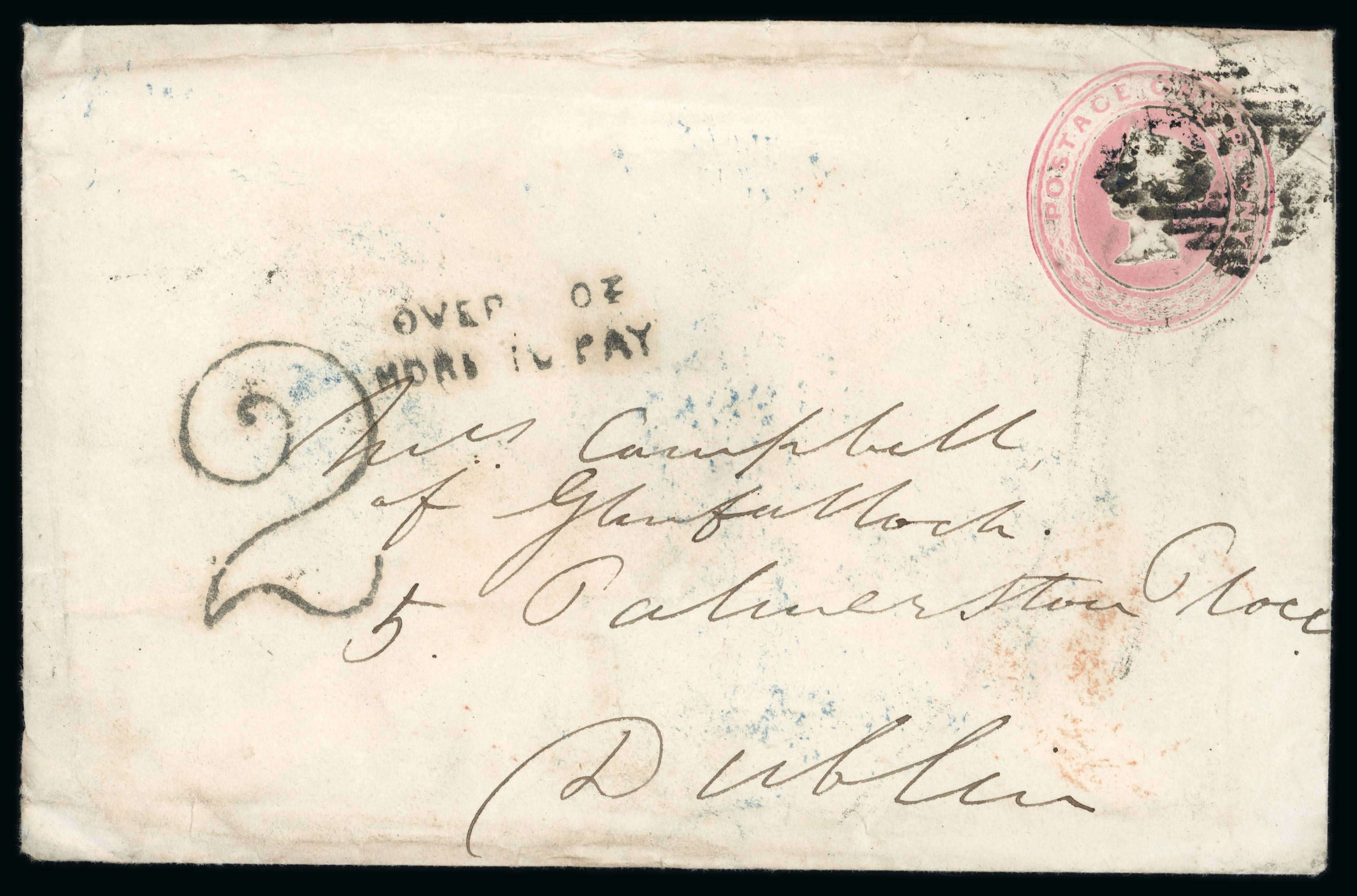 1854-68 Two envelopes, both bearing clear handstruck "2" and two types of the unusual 2-line OVER ___ OZ/MORE to PAY, one on 1d pink envelope from Parsonstown to Dublin, the other franked 1d red, plate 78 tied Derry duplex, an fine pair