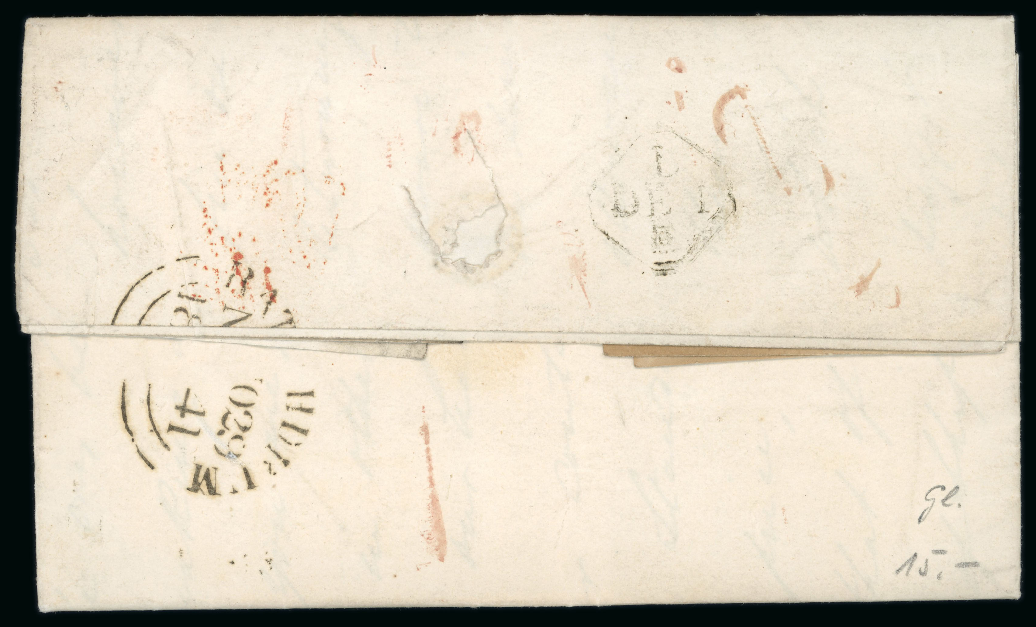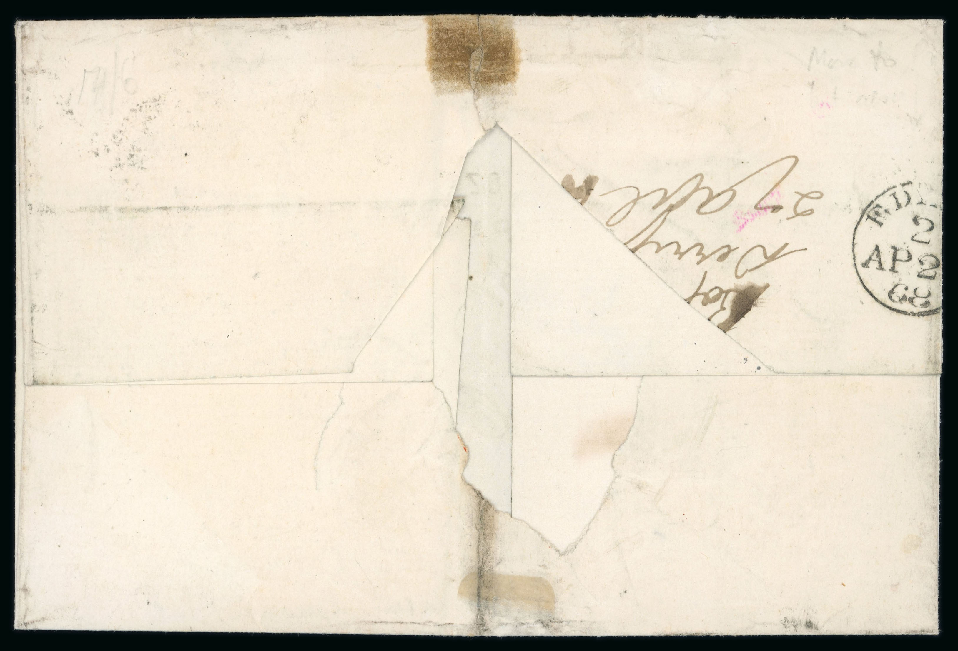 1841 (3.6) Folded cover from Moate, Co. Westmeath to Dublin, franked 1d red, good even margins, unusually tied by two black MC cancels, plus three single 1d reds with Irish MCs, fine and unusual usage of the two crosses. (Image 1)
