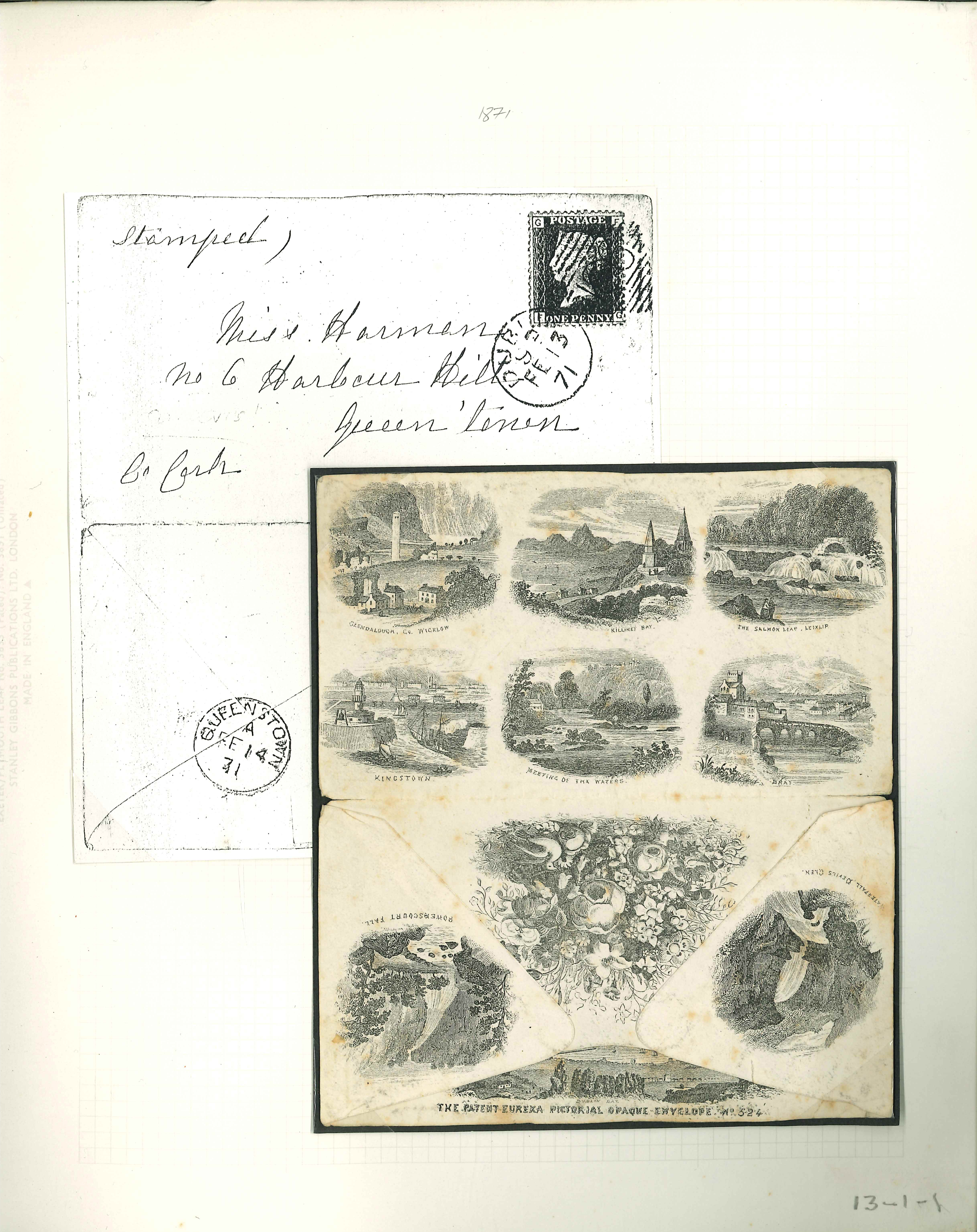 Wicklow: 1871 Envelope from Dublin to Queenstown, Cork, franked 1d red tied Dublin duplex, showing "THE PATENT EUREKA PICTORIAL OPAQUE ENVELOPE No.524" pictorial inside with scenes of County Wicklow, few tone spots, attractive and scarce