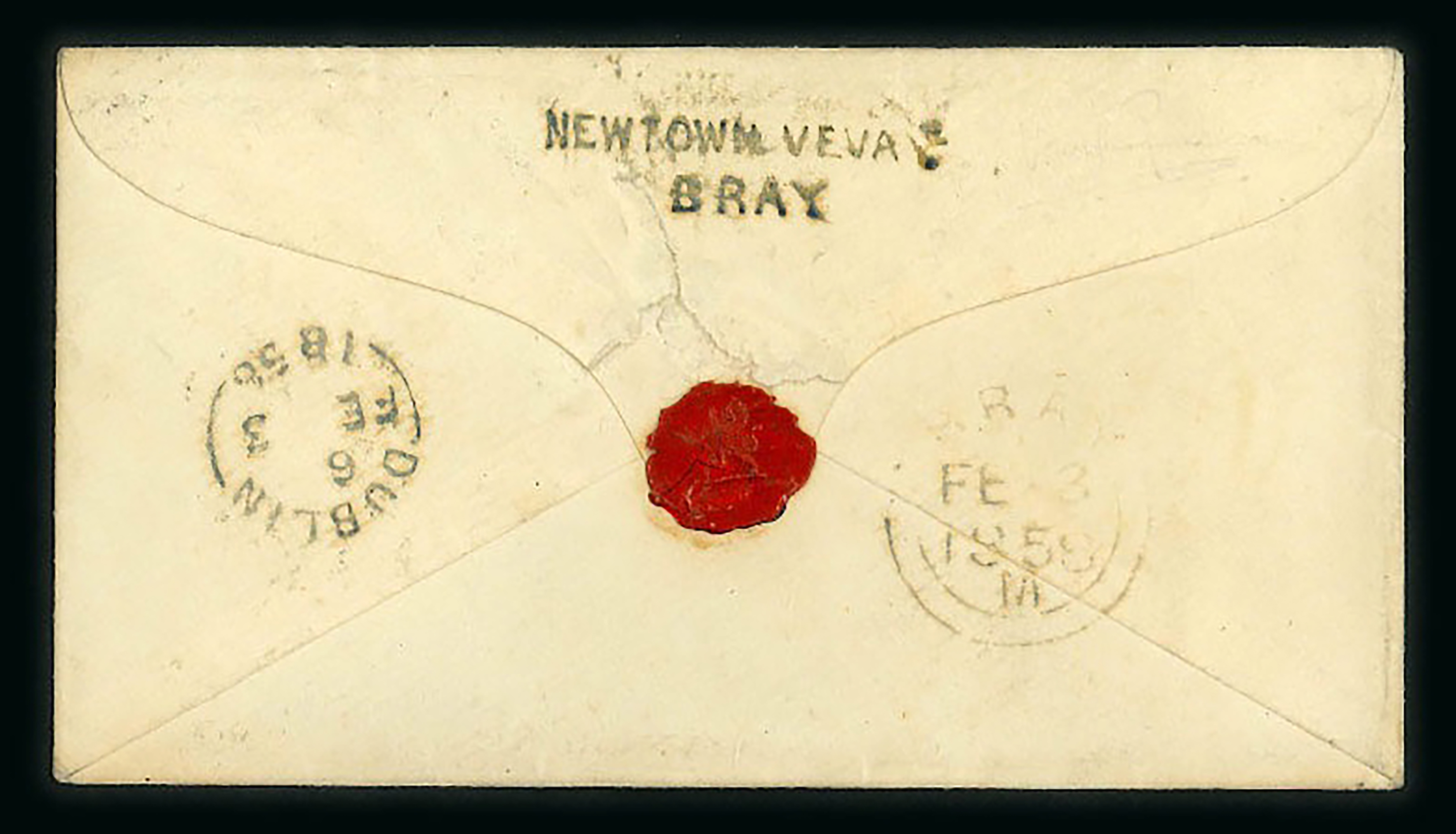 smaller type WICKLOW/24 in red (6), italic Rathdrum/Penny Post in black (2), Stratford/Newbridge in black, undated circle BELLEEK, RATHNEW in blue, all strikes are fair to very fine, a scarce group (40) (Image 1)