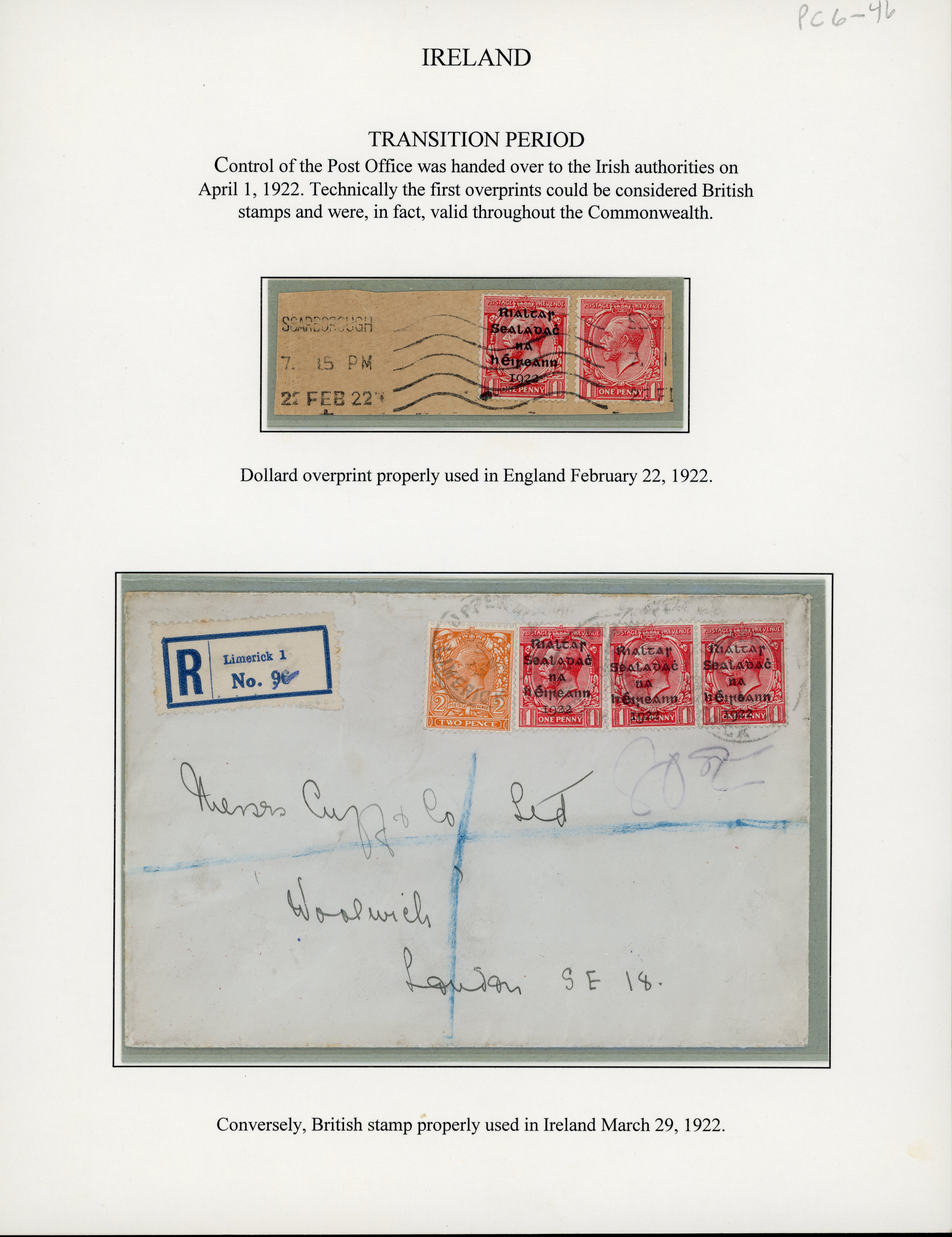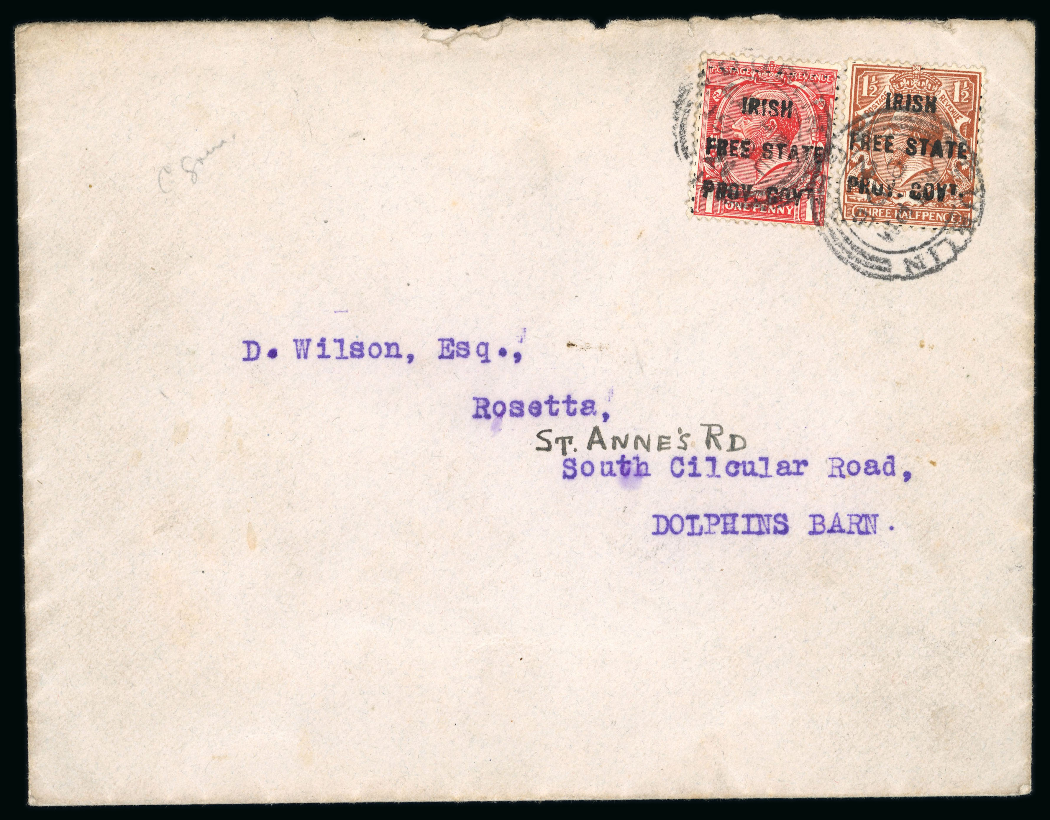 DUBLIN: 1921 Envelope franked GB 1d scarlet and 1 1/2 brown, overprinted IRISH / FREE STATE / PROV.GOVt, tied by two strikes of DUBLIN/DEC.19.1921 circular date stamp, a very fine and rare usage of the unofficial overprint. (Image 1)