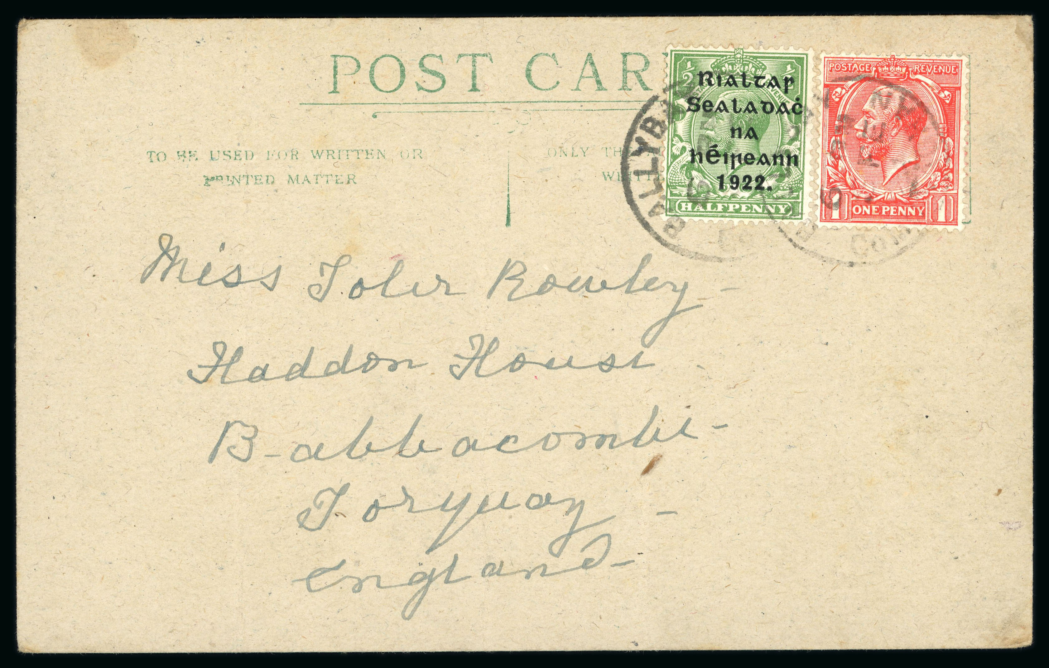 1924 (5.2) Postcard to Torquay, England, franked Harrison 1/2d green in combination with GB 1d scarlet, both tied BALLYBAY/CO.MONAGHAN/5.FE.24 cds, some creases, a fine and scarce late usage of a GB stamp used in Ireland (Image 1)