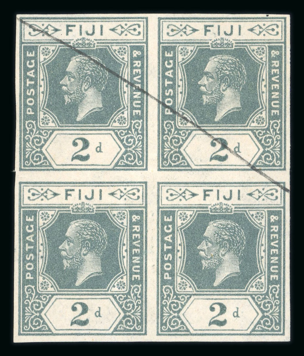 1922 De La Rue Paper Trial: Fiji 2d grey with "SE" watermark, block of four with gum and pen stroke, fresh, very fine and scarce (Hib.E167, €1'000+) (Image 1)