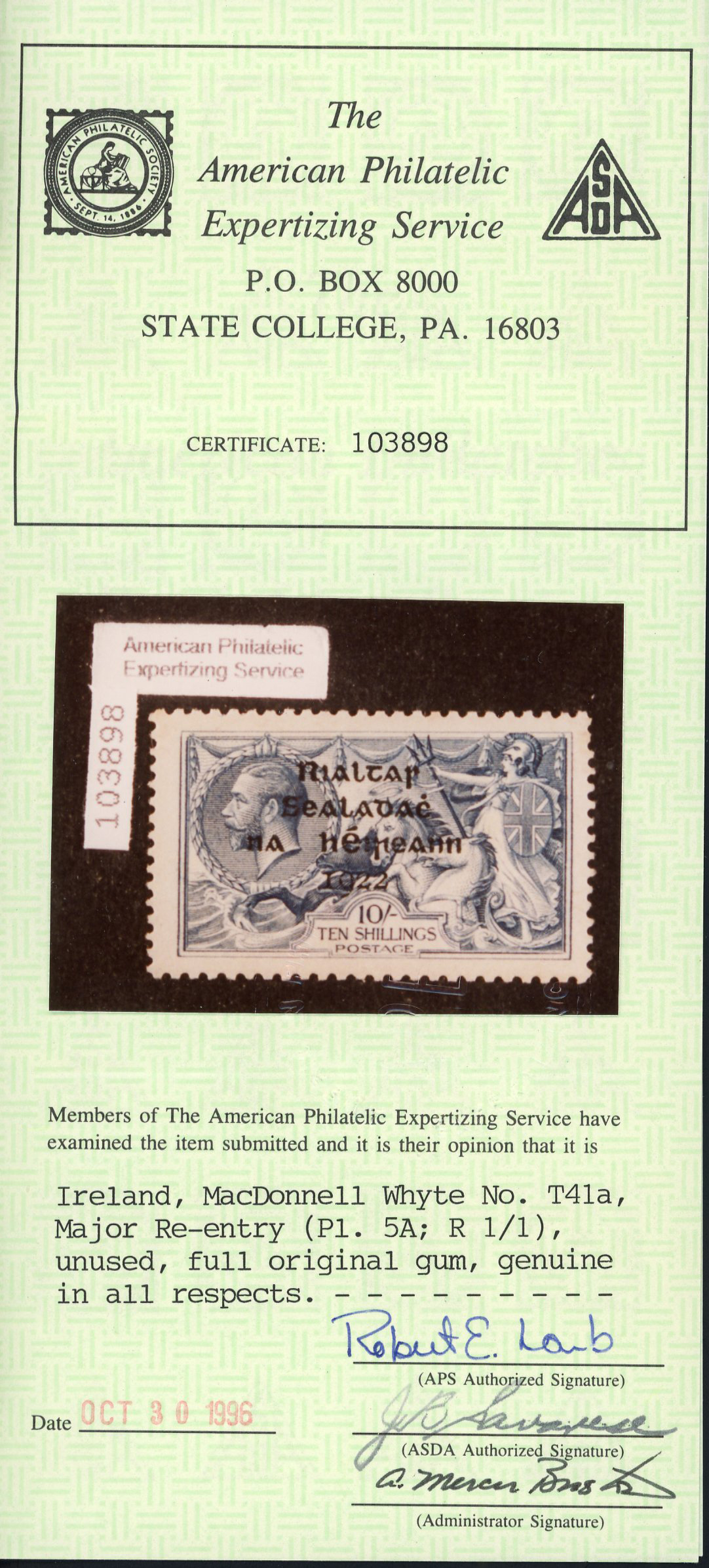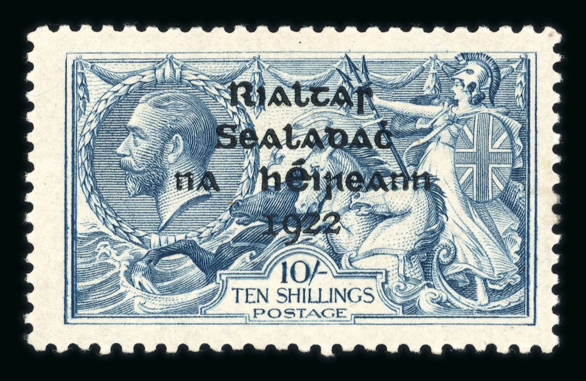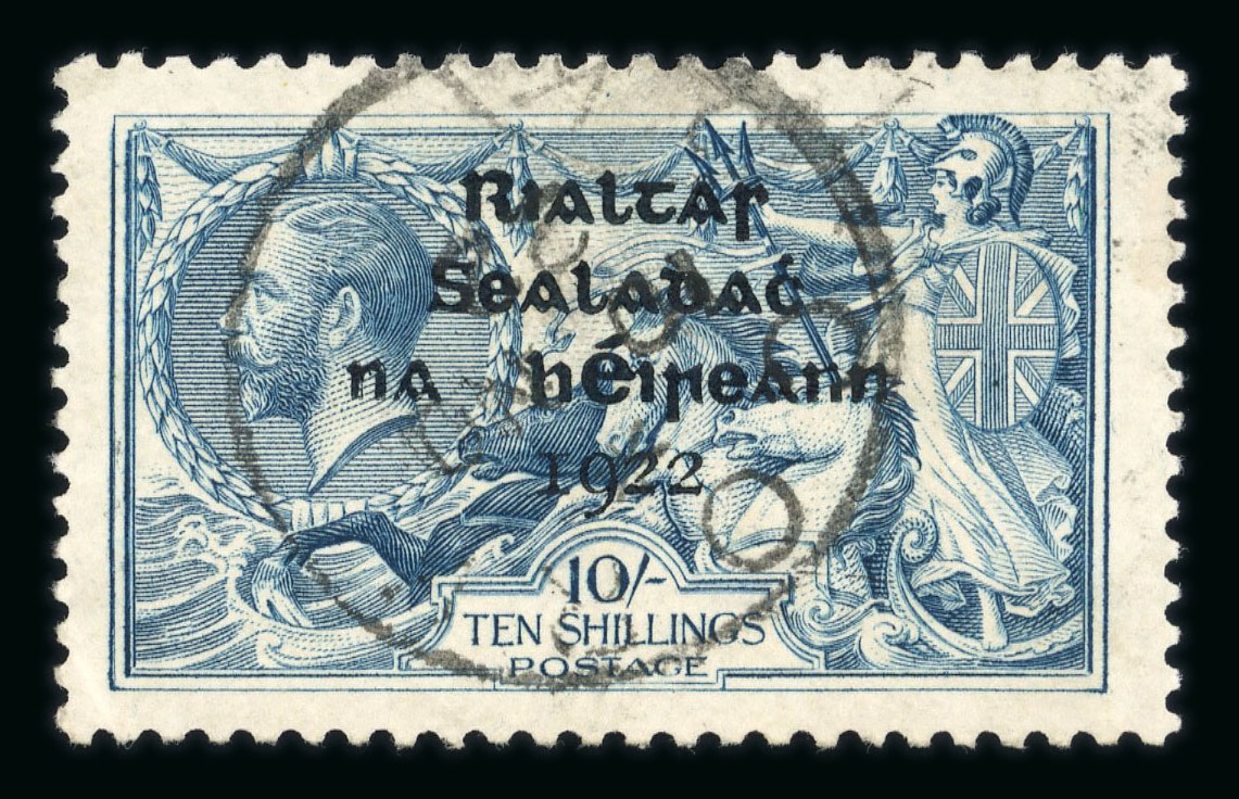10s dull grey-blue, mint single, showing "major re-touch" from plate 5A and position R2/1, fresh, very fine and an important rarity on the popular Thom high value, cert. David MacDonnell (1987) (Hib. T41b, €7'000) (Image 1)