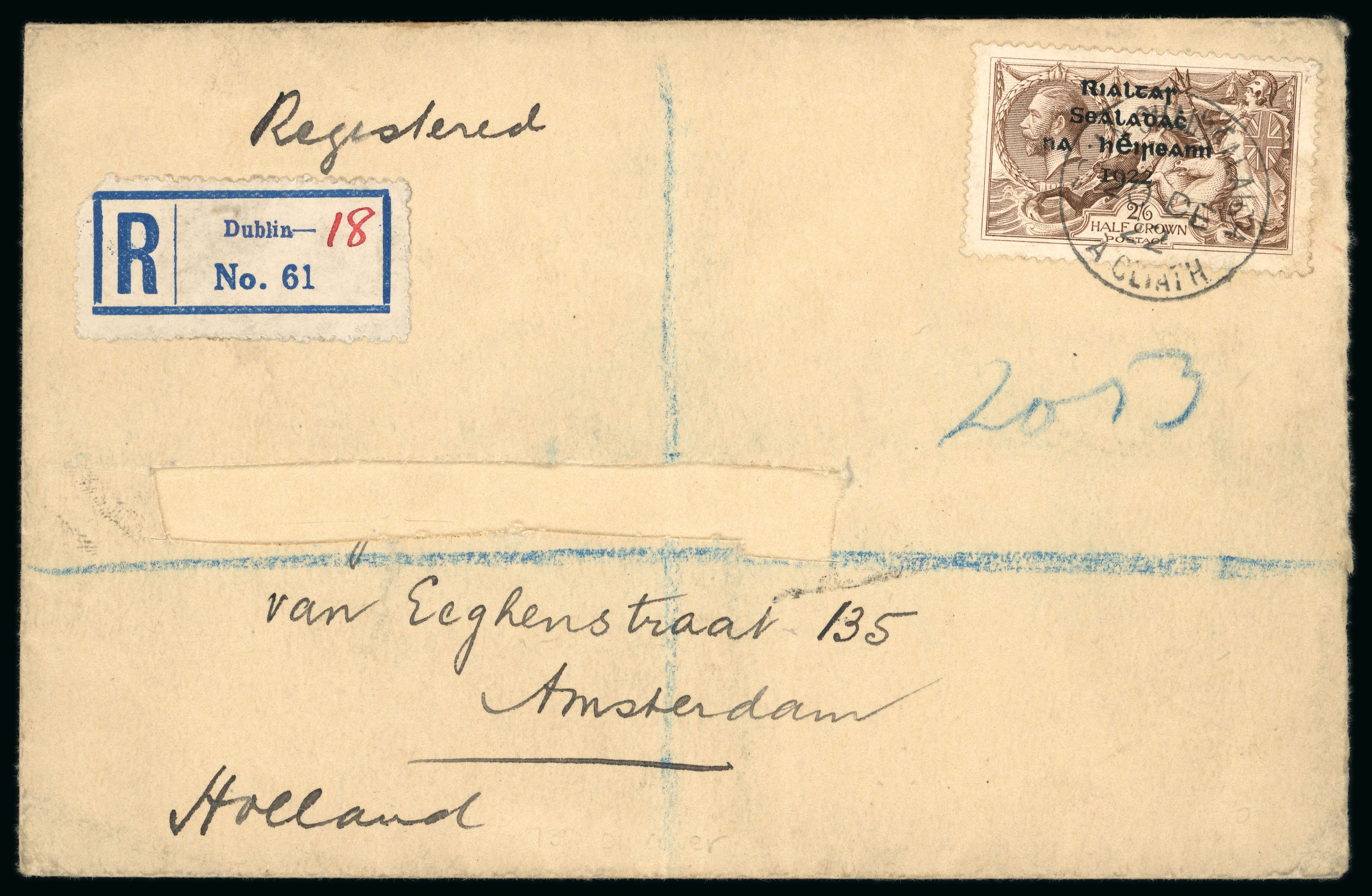 2s6d grey-brown, single tied on registered envelope from Dublin to Amsterdam, with Dublin "18" registered label alongside, the addressee's name removed, a fine and very scarce usage (Image 1)