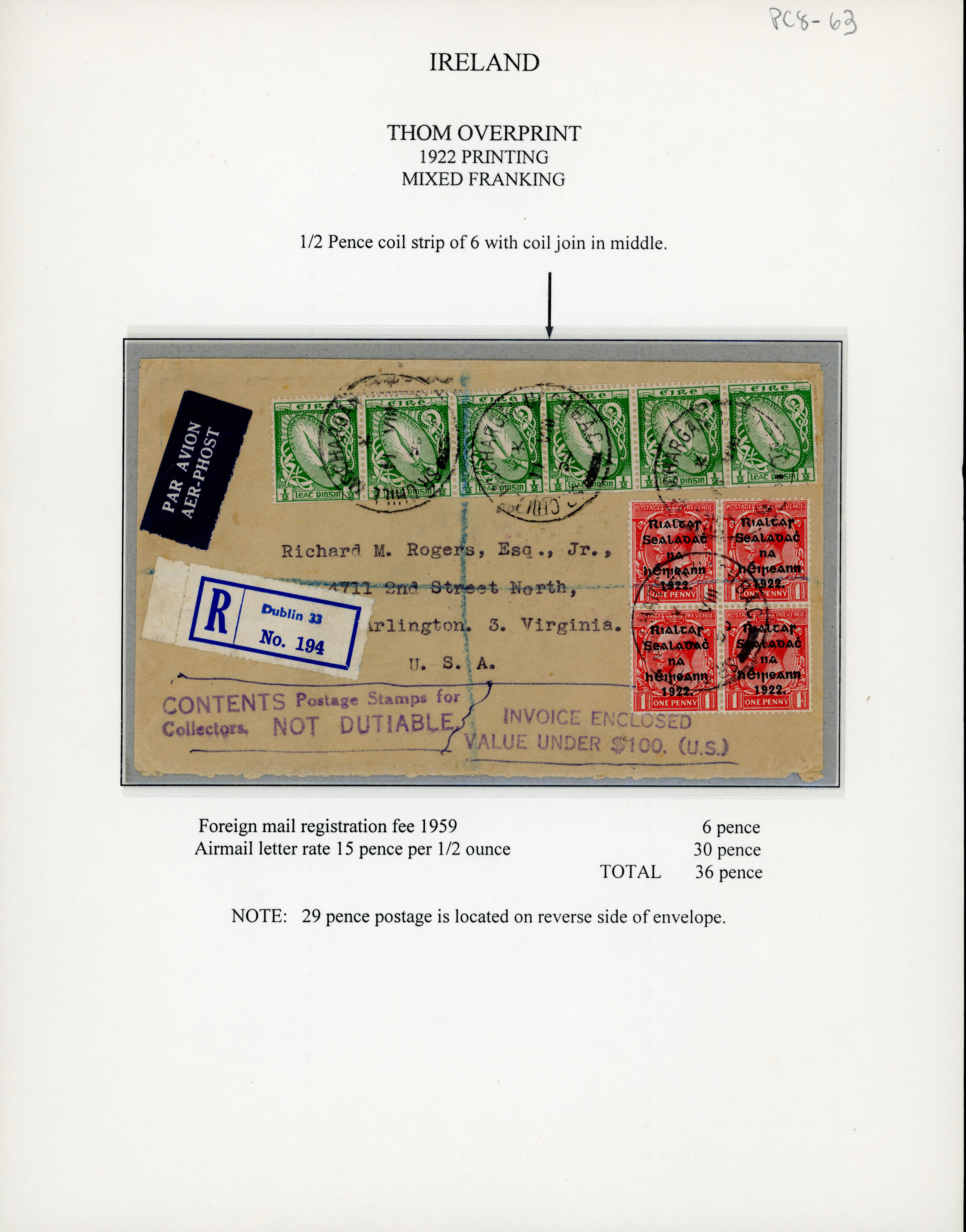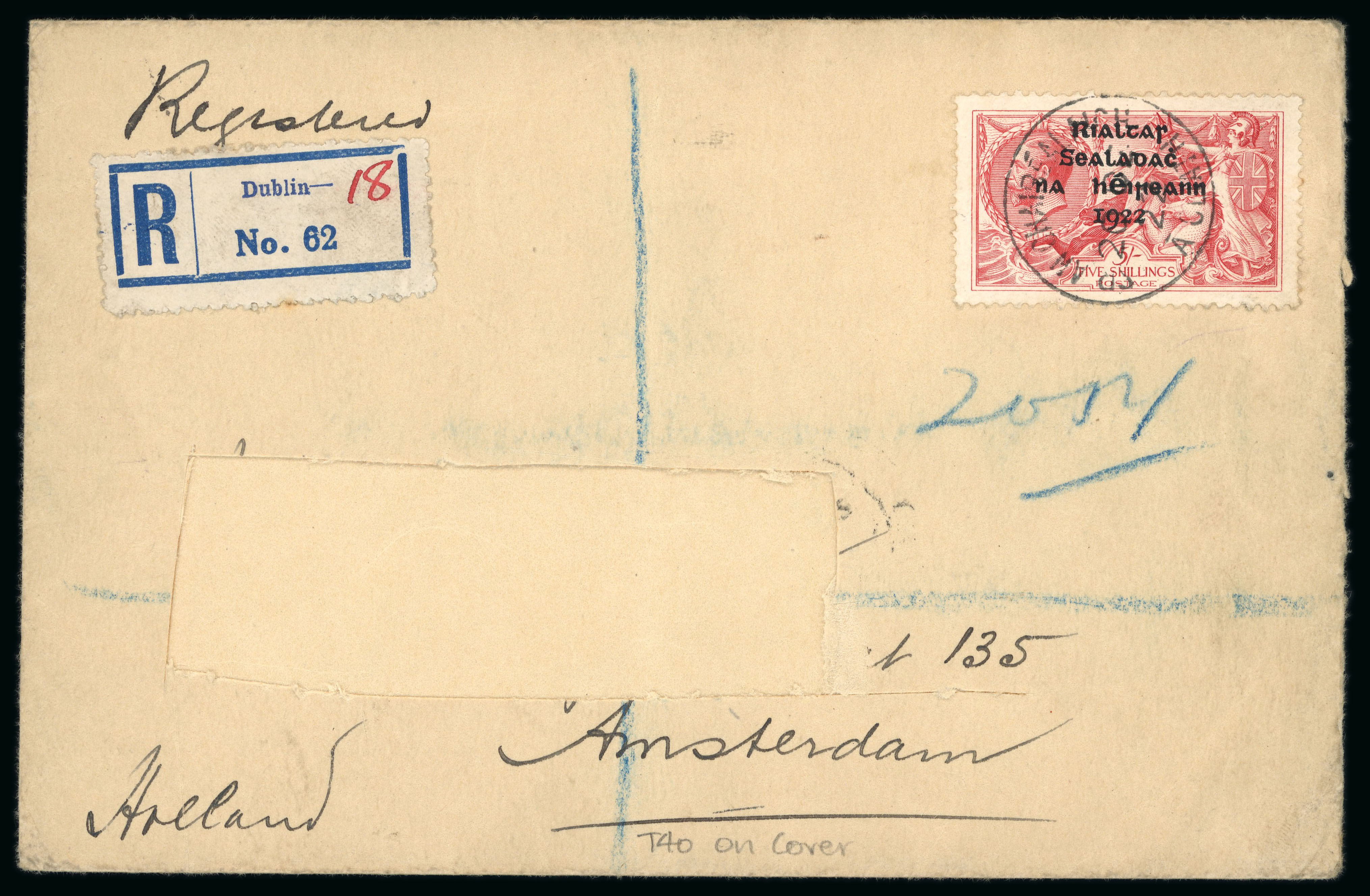 5s pale rose red, single tied on registered envelope from Dublin to Amsterdam, with Dublin "18" registered label alongside, the addressee's name removed, a fine and very scarce usage (Image 1)