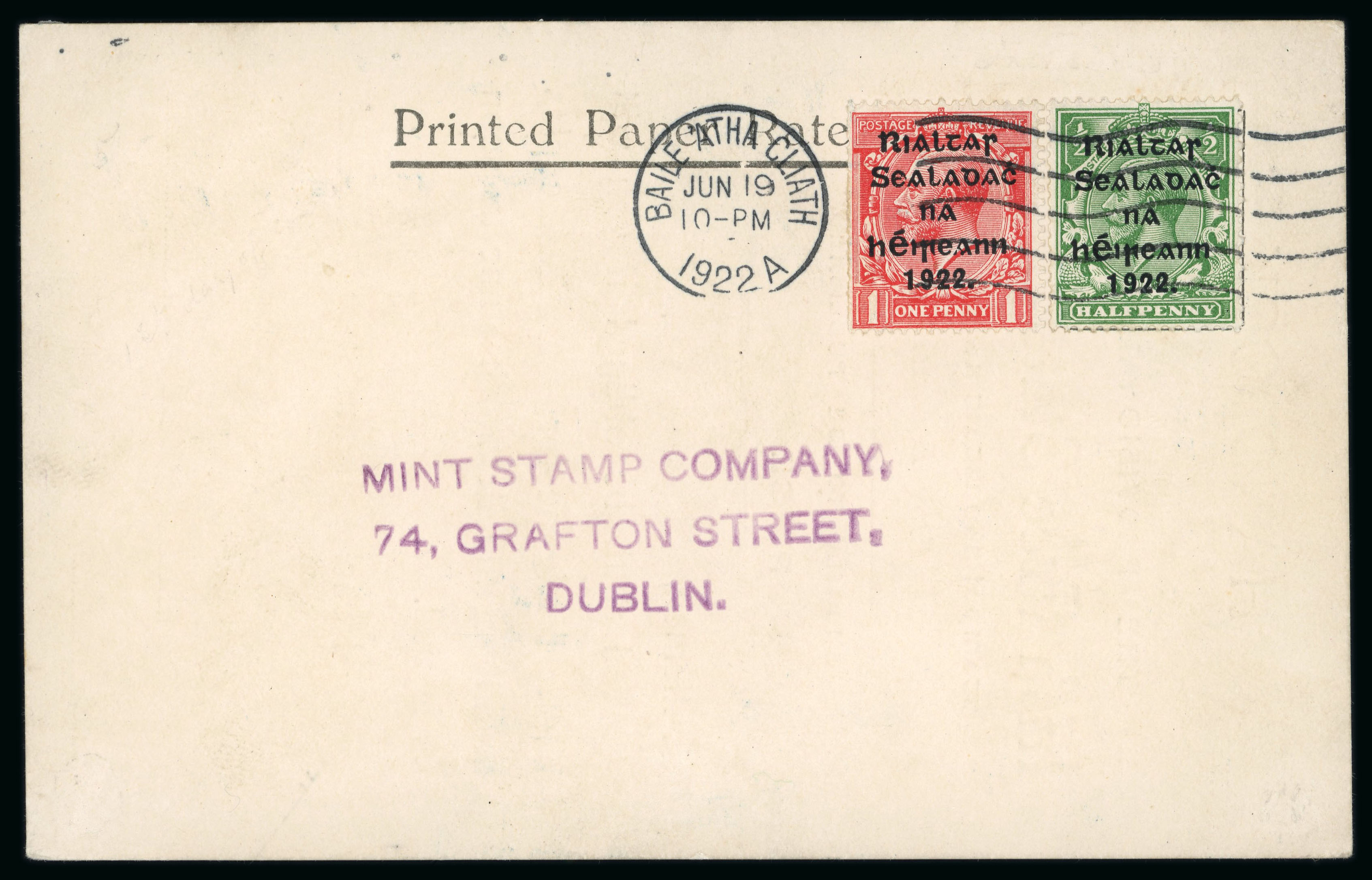 1/2d green and 1d scarlet, neatly tied by wavy line cancel with BAILE ÁTHA CLIATH/JUN.19.1922 first day datestamp alongside, on Irish Free State Stamps printed card to Dublin, fresh, very fine and a rare first day of issue (Hib. €1'500)
