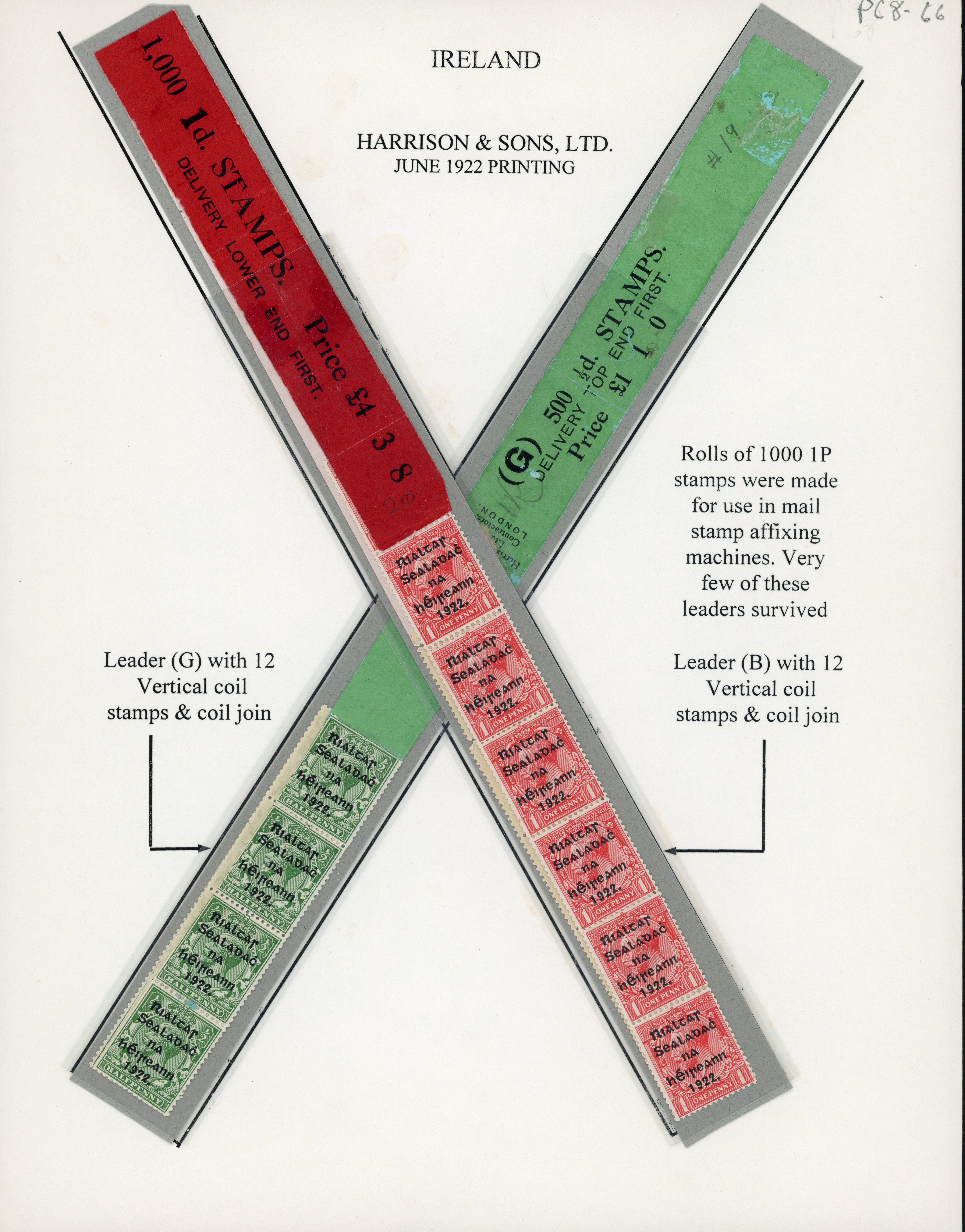1/2d green, 1d scarlet and 2d orange, coil leaders lettered G, B, R, T some separations, all mounted and written up on two album pages, fresh, very fine and scarce (Hib. TL2, TL10, TL12, €760+) (Image 1)