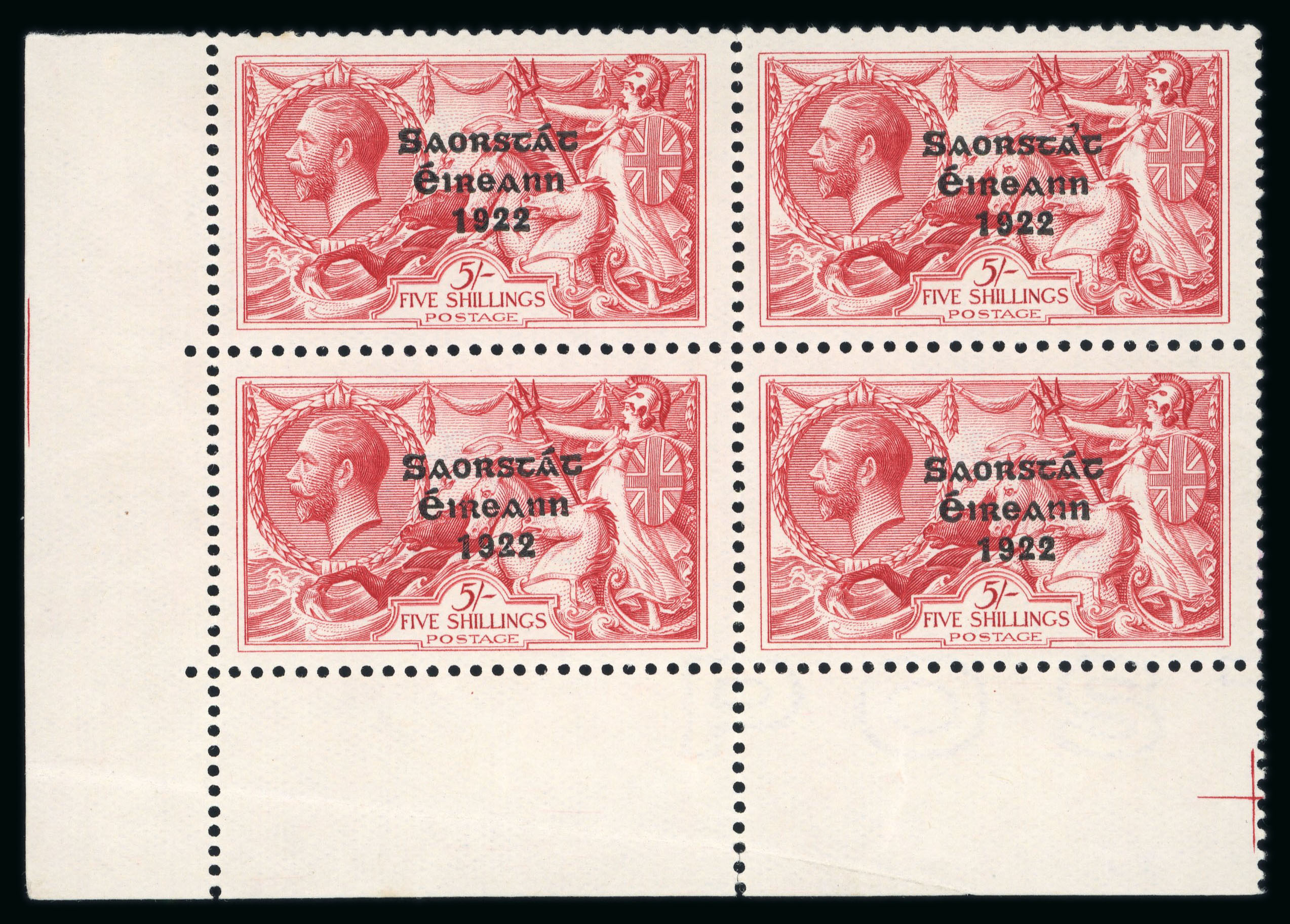 5s rose-red, mint bottom left corner sheet marginal block of four, top right stamp showing "circumflex accent" variety, some perforation reinforcements, fine and scarce (Hib. €645+) (Image 1)
