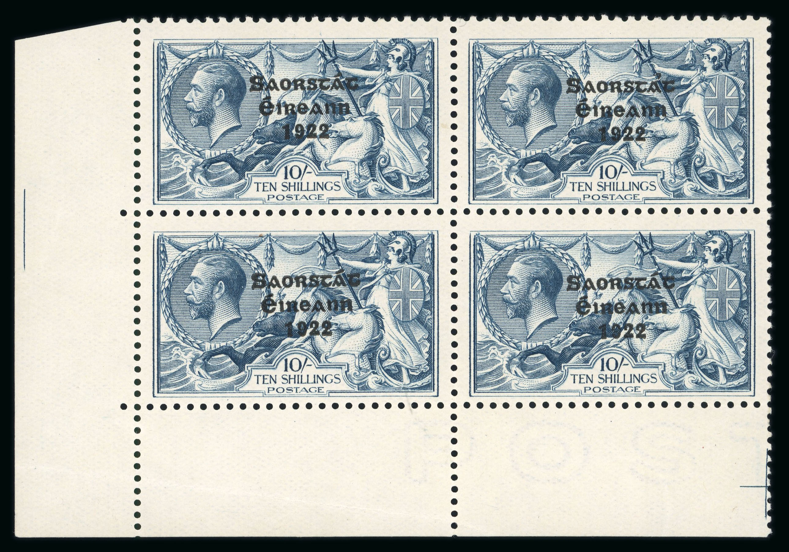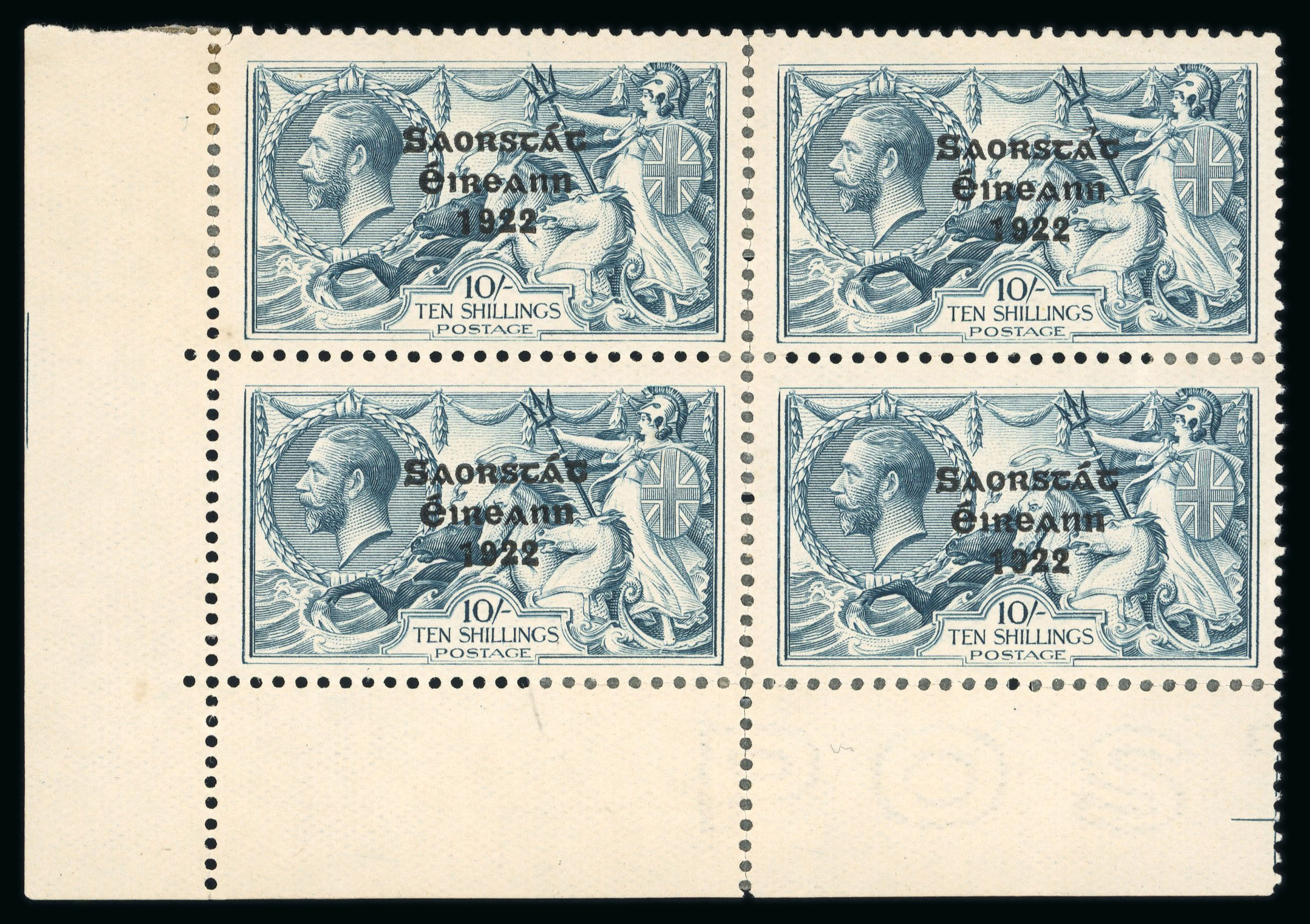10s dull grey-blue, mint and mint nh bottom left corner sheet marginal block of four, top right stamp showing misformed accent with con-caved top of "A" top right variety, fresh, very fine and scarce (Hib. €1'835+) (Image 1)