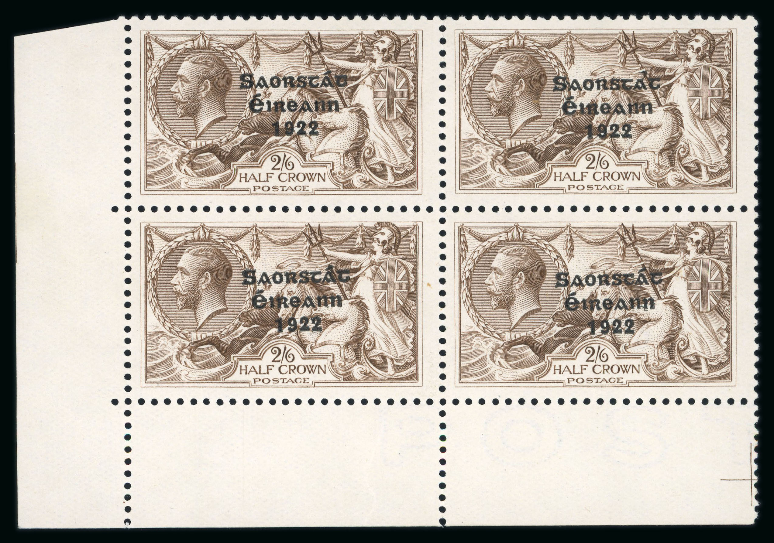 2s6d chocolate, mint and mint nh bottom left corner sheet marginal block of four, top right stamp showing "circumflex accent" variety, fresh, very fine and scarce (Hib. €455+) (Image 1)