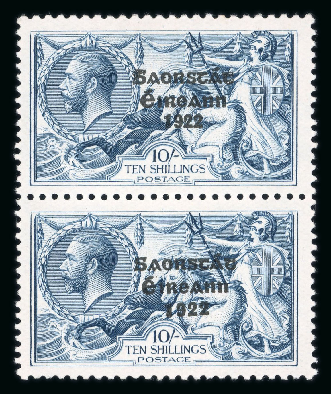 10s grey-blue, mint vertical pair, top stamp showing minor variety "hollow accent", fresh, fine and scarce (Hib. T71v, €1550) (Image 1)