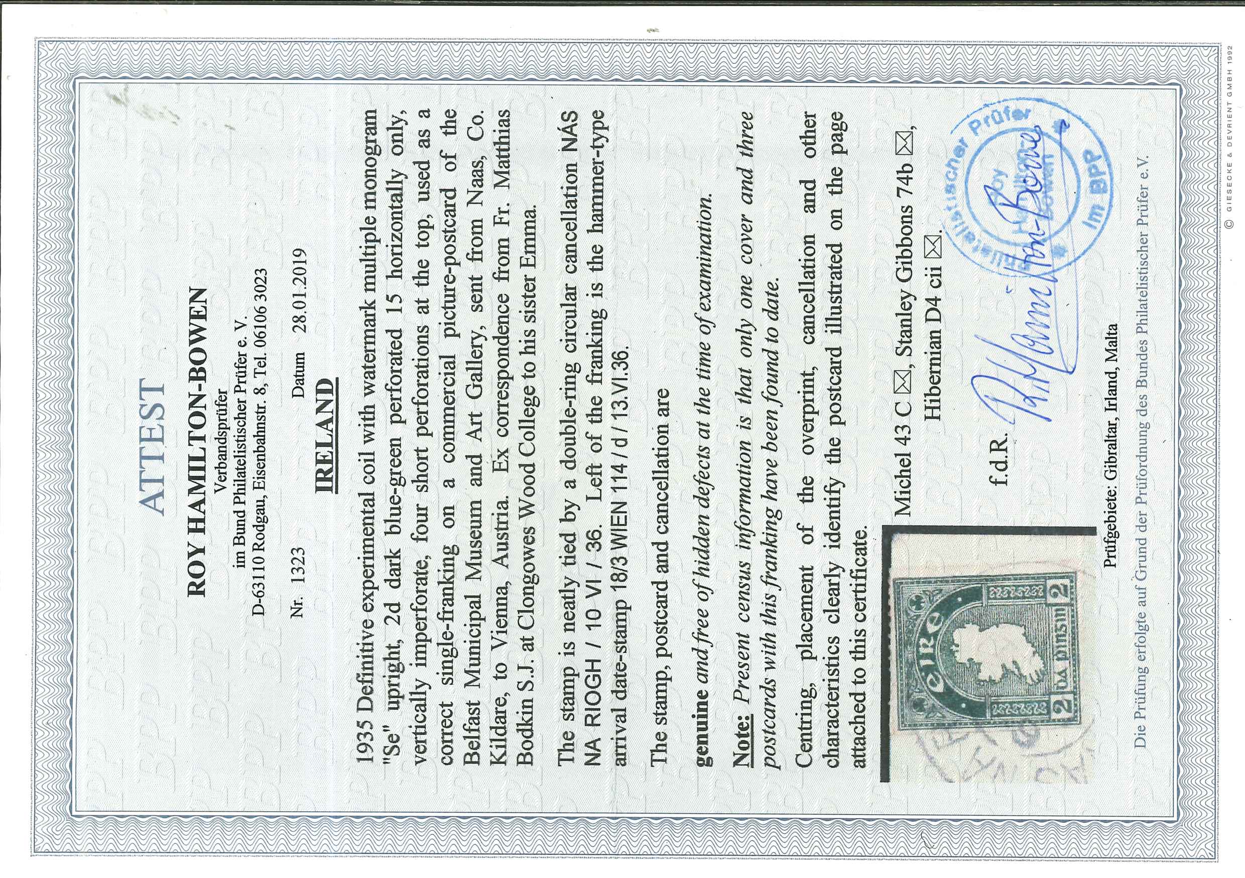 usage of this stamp in County Limerick; cert. BPP (2019) (Hib. D4cii, €2'800). (Image 1)