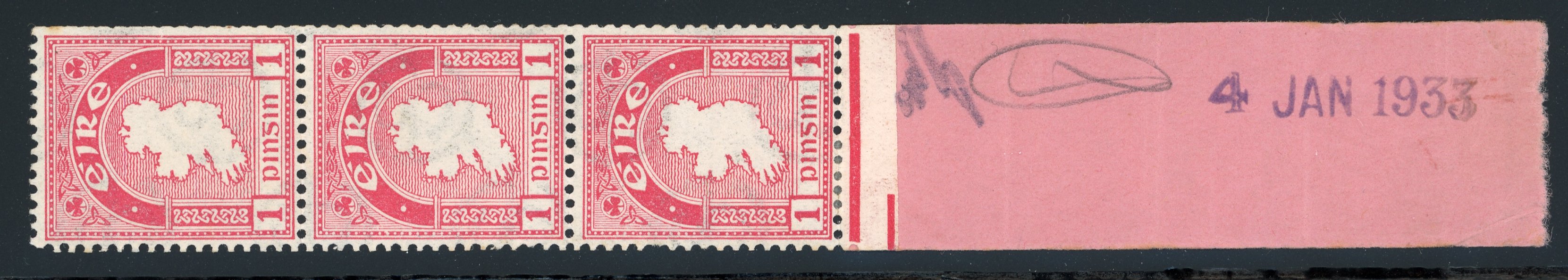 1922-23 SE 1d red vertical strip, dated "4 JAN 1933" coil end, reinforced with hinge, fine and very scarce. (Image 1)