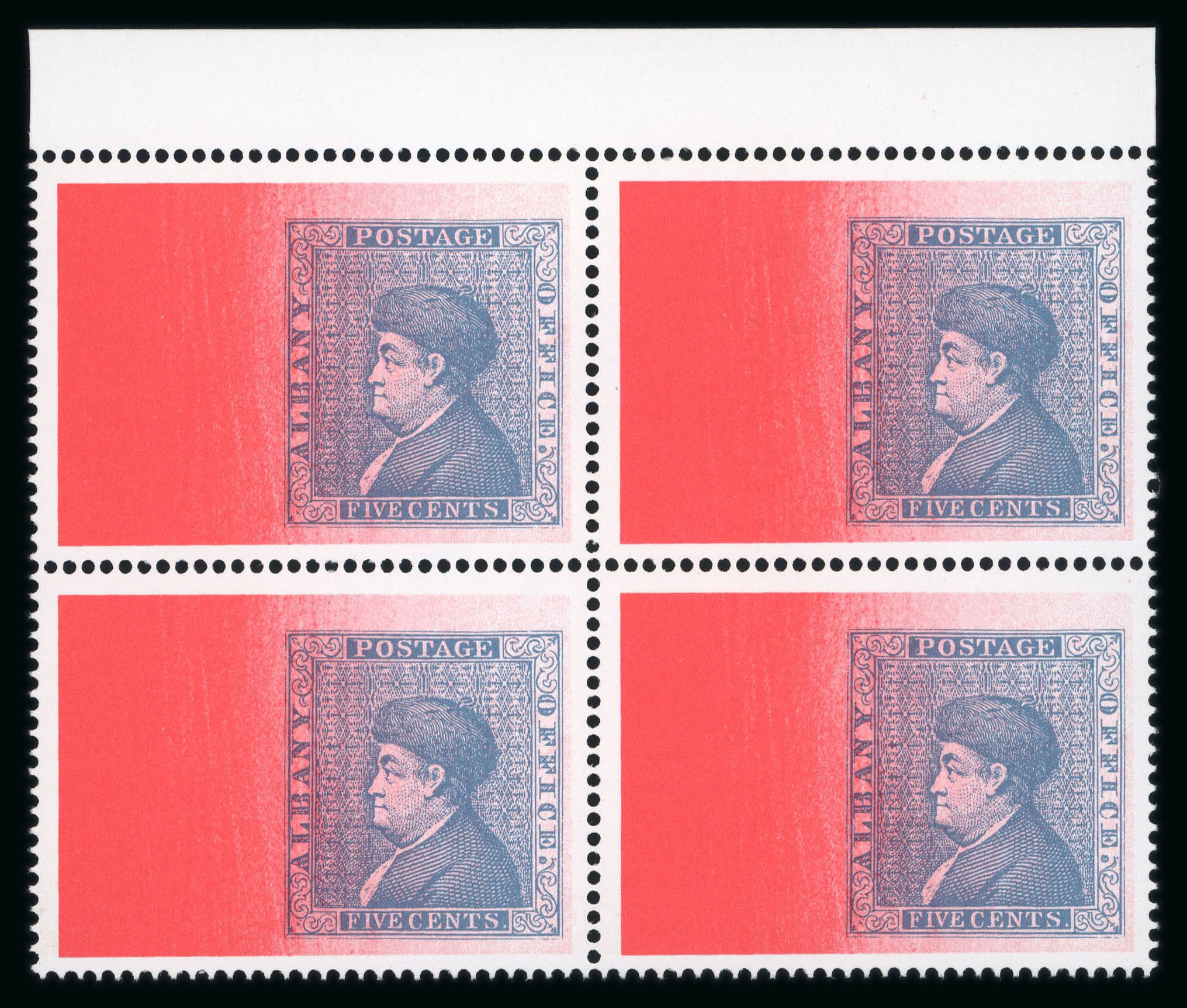1976 U.S. Bicentenary 15p mint nh top sheet marginal block of four, positions 3-4/13-14, all showing missing silver variety, fresh, very fine and exceptionally rare in a mint marginal multiple, all signed "Df" (David Feldman) (Hib.