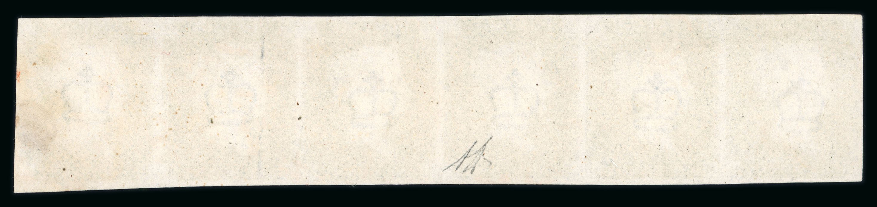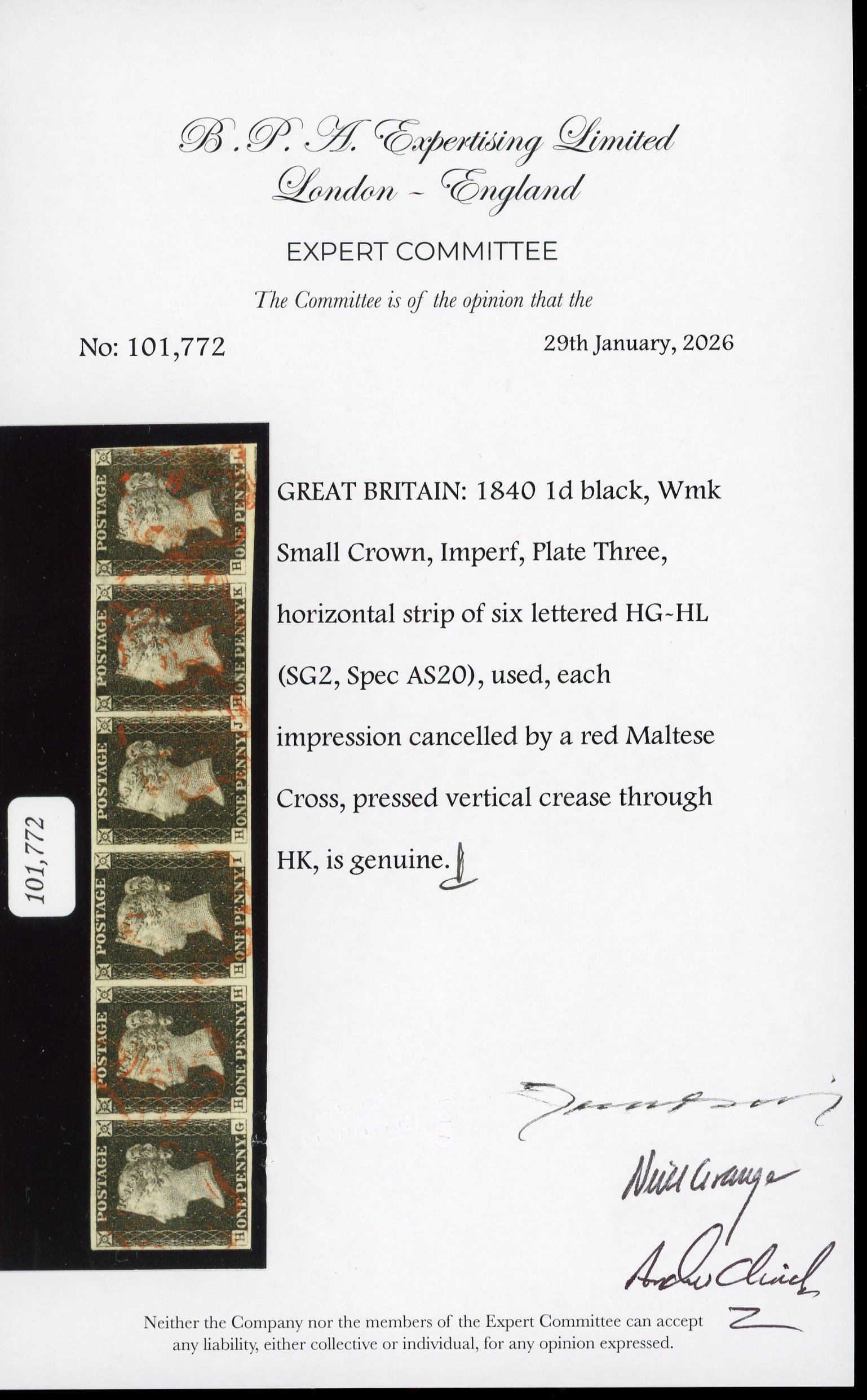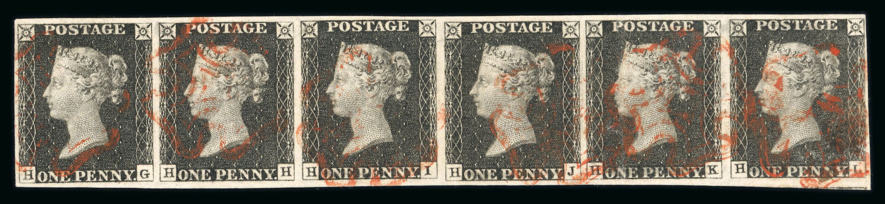 1840 1d Black, Plate 3, HG–HL, horizontal strip of six. Good to large margins all round, lightly struck red Maltese Crosses. Pressed vertical crease on HK. A most attractive and rare multiple from this plate.