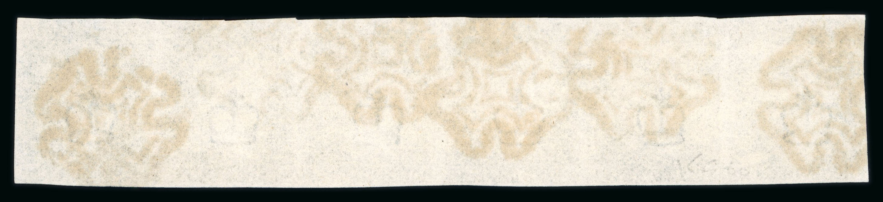 1840 1d Grey-Black, Plate 5, horizontal strip of five EC–EH. Clear to good margins, six fine strikes of black Maltese Cross. Tiny repair at top of EF, otherwise superb quality. A fine and scarce multiple. (Image 1)
