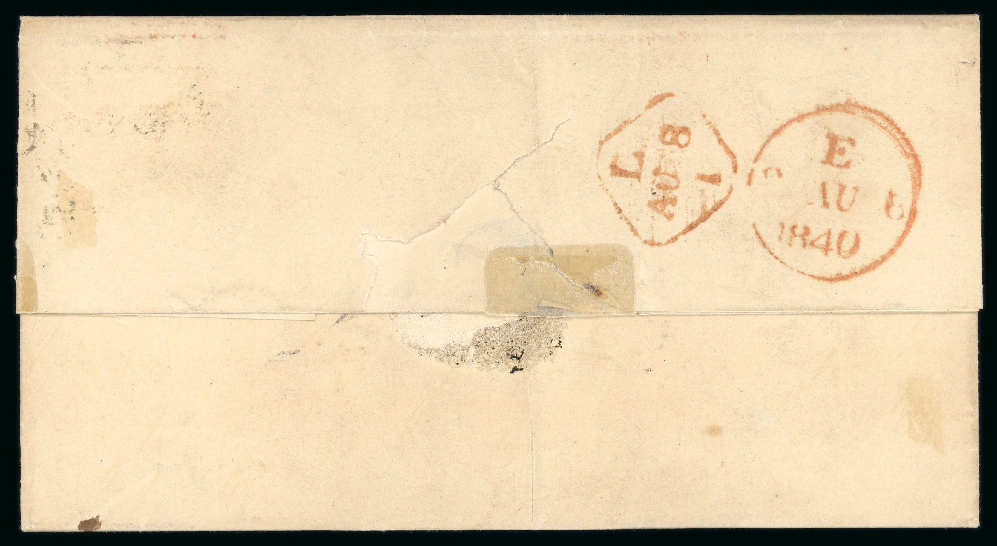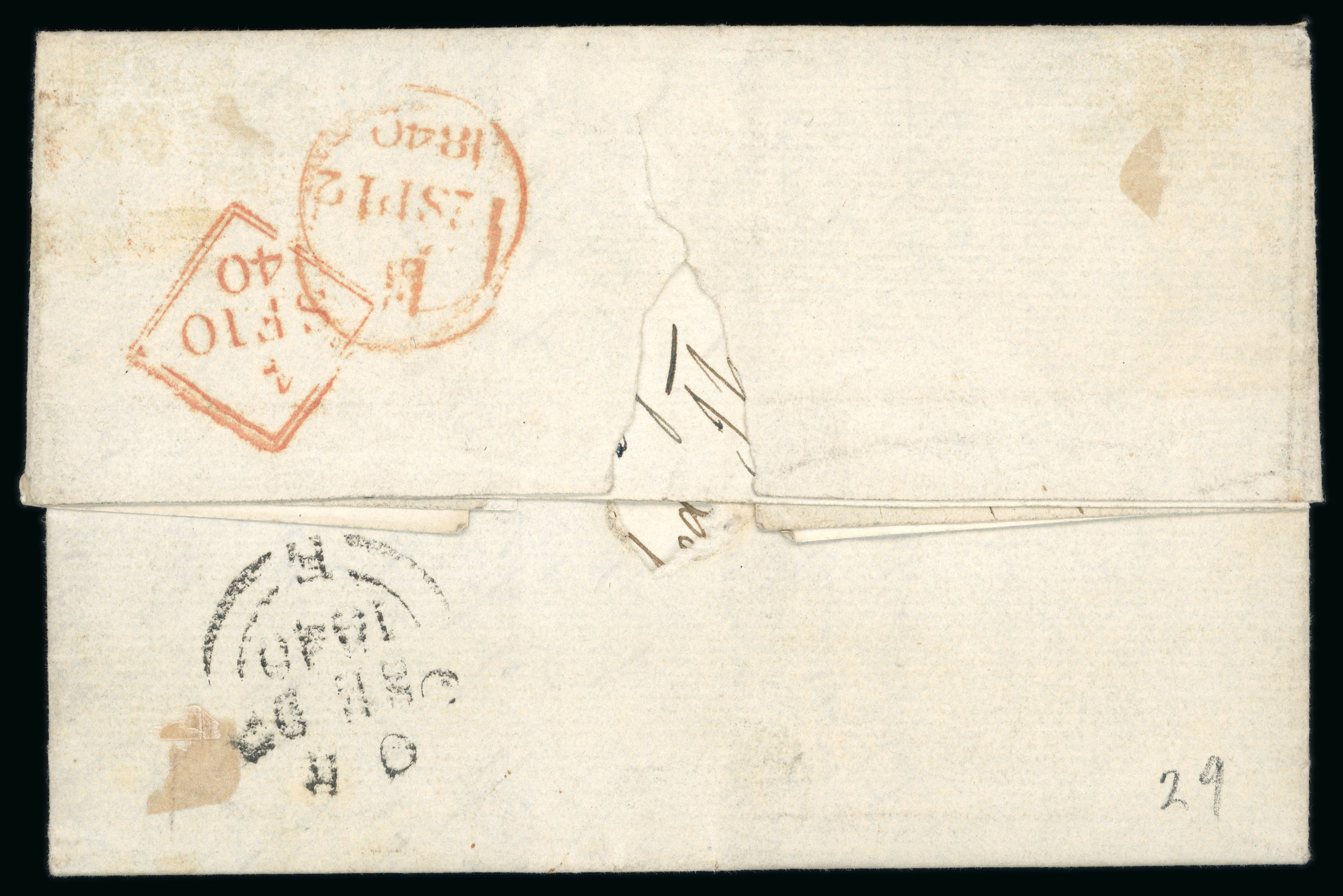 cds, SE 10 and SP 12 1840 transit via Dublin, and arrival marks. Four single 1d Blacks on an entire are seldom seen—a scarce Irish cover from Cork. (Image 1)