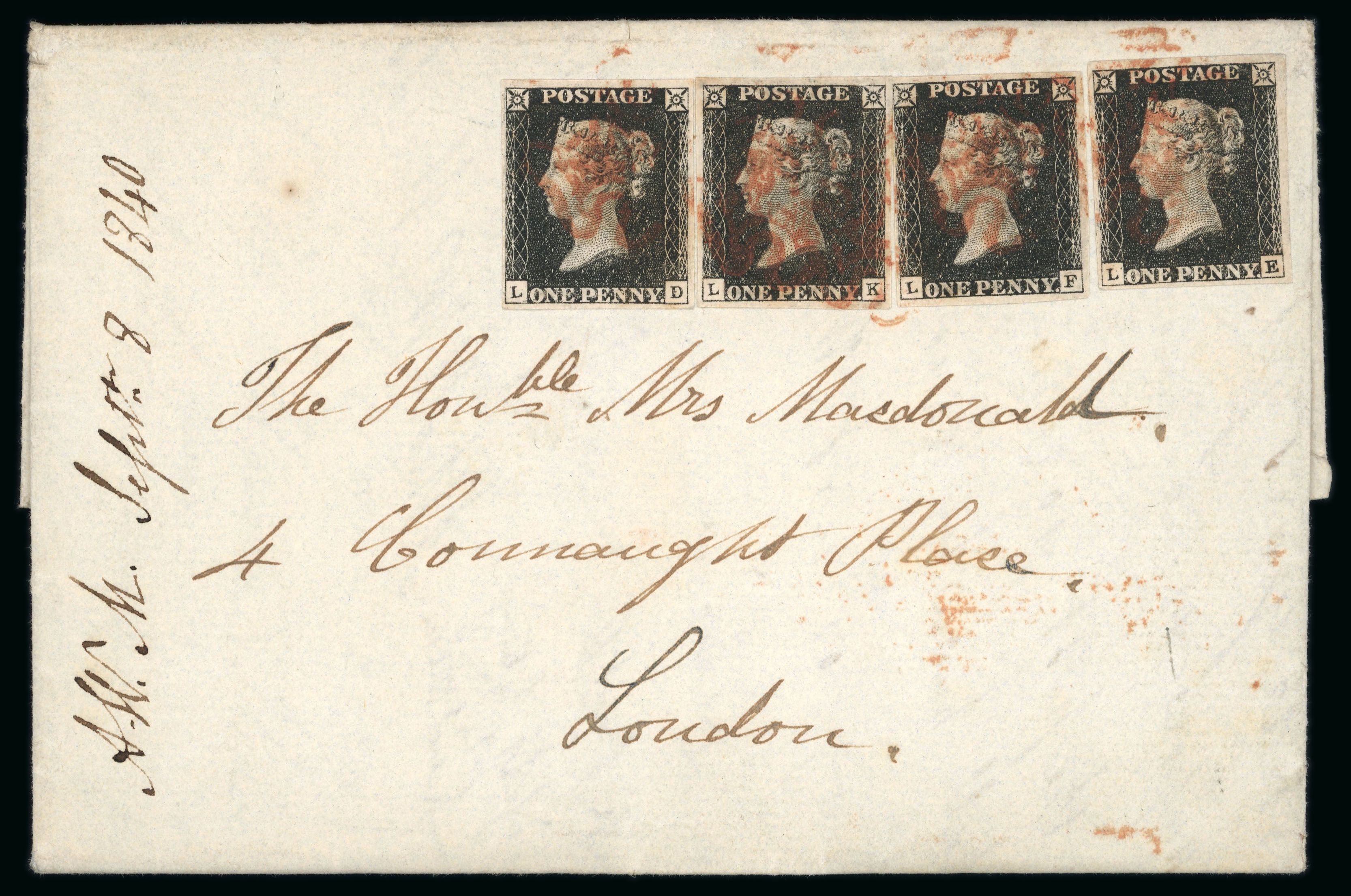 Usage from Ireland1840 1d Black, Plate 4, LD, LK, LF, and LE. Four singles on entire letter from Cork Barracks, 8th September 1840, to London. Each stamp with four margins, tied by indistinct red Maltese Crosses. Cork SE 9 1840 departure