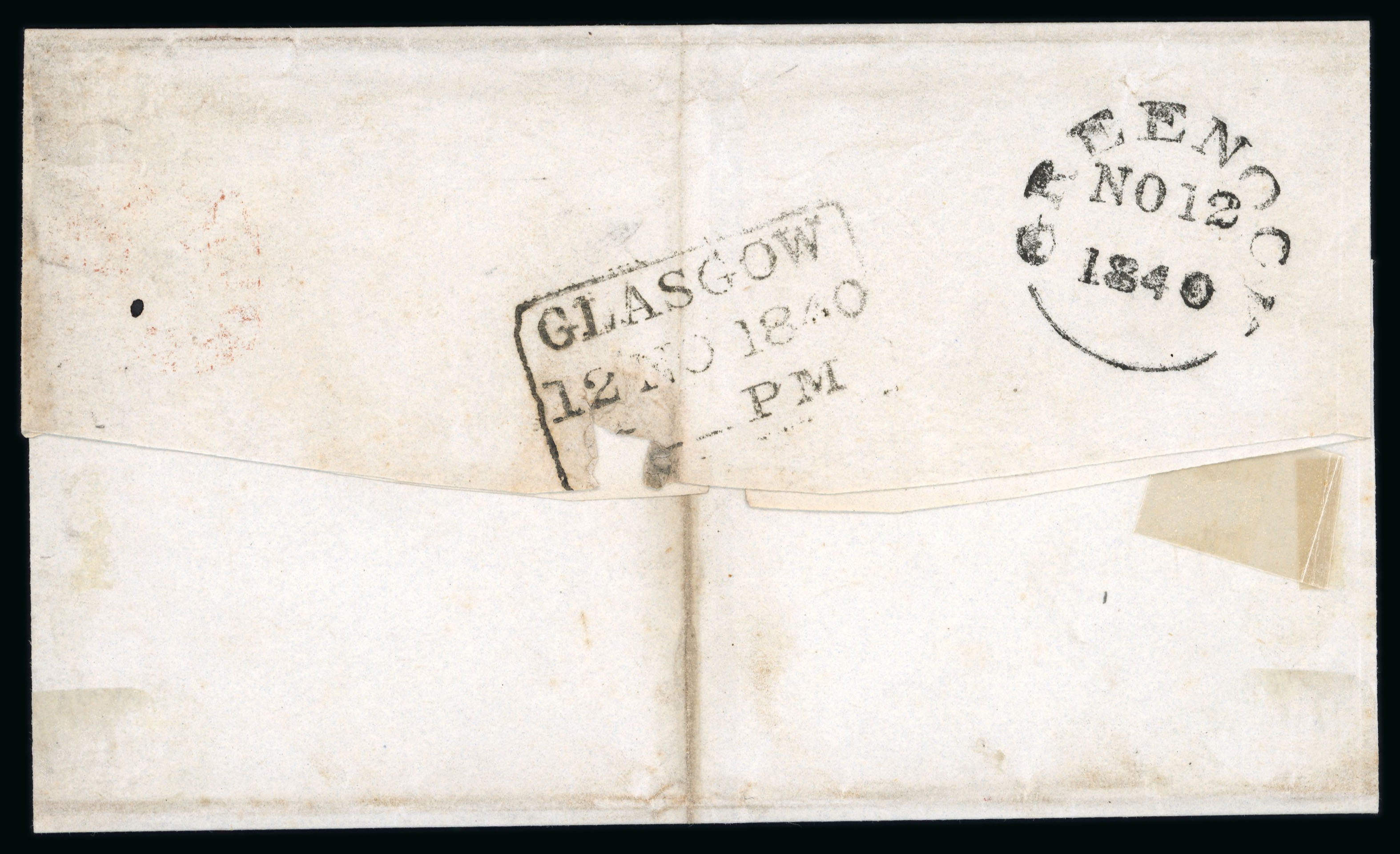 1840 1d Black, Plate 4, ED. Four margins on cover from Greenock to Glasgow, tied by red Maltese Cross. Fine strikes of Greenock NO 12 1840 departure and Glasgow 12 NO 1840 PM on reverse. Vertical filing fold well clear of the stamp. An