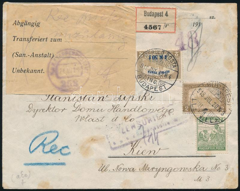 Lot 189 - 1918. július 20-án Budapesten feladott ajánlott cenzúrázott légi levél Kijevbe, a Budapest-Bécs-Krakkó-Lemberg-Kijev légi járattal, rajta a kézbesítési előjegyzési cédulával. A szakirodalom összesen 2 db Kijevbe címzett levelet és 1 levéldarabot ismer, ezért ez a levél rendkívüli ritkaság, unikális példány! Az aukciós piacon eddig 1918-as kijevi levél nem bukkant fel, ilyen még a Bélyegmúzeum tulajdonában sincs! Sosem látható darab! RRRRR! 1918.07.20. Registered censored airmail cover from Buda.... Currently HUF 5,500,000