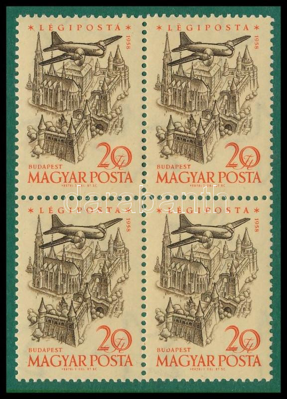 1958 Repülő VI. 20f négyestömb felülről nyitott "D" betű lemezhibával / Mi 1561 block of 4 with plate variety (Image)(Image 1)