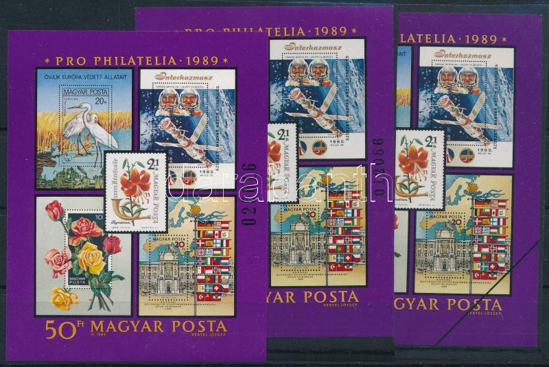 1989 Pro Philatelia 3 db blokk: kis és nagy sorszám, MINTA változat (Image)(Image 1)