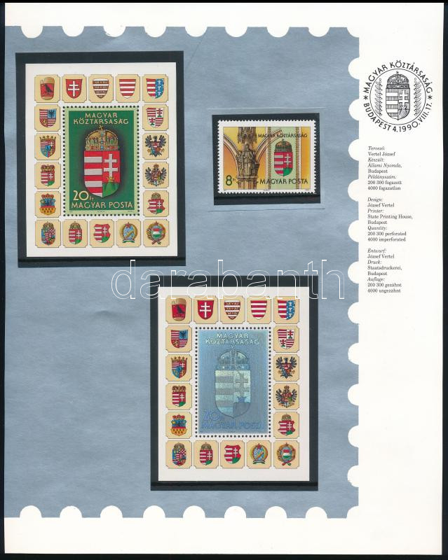 1990-1991 A Magyar Köztársaság címere I. és II. blokkok, a II. piros sorszámmal + bélyeg (71.750) (Image)(Image 1)