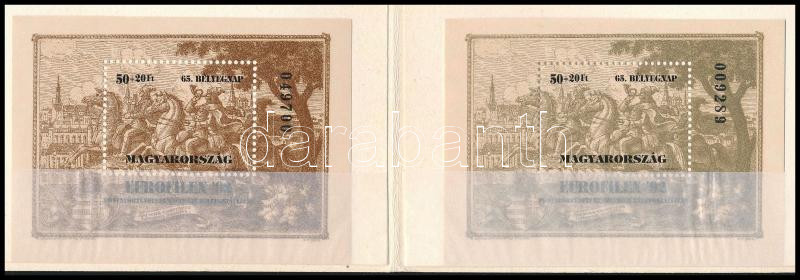 1992 Bélyegnap (65.)- EUROFILEX 2 db blokk különböző színárnyalatban, tokban (a világosabb blokk enyhe töréssel) / Mi Block 221 + 221 I. (21.000) (creases)