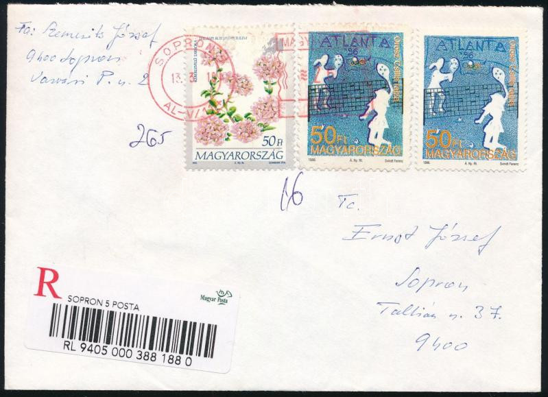 1996 A posta kárára elkövetett Olimpia 50Ft hamisítvány díjkiegészítéssel 2013-as ajánlott Sopron helyi levélen + támpéldány / Registered local cover with 50Ft forgery, a fraud committed against the post office (Image)(Image 1)