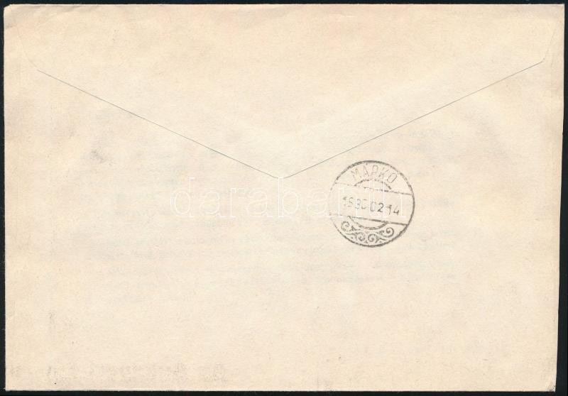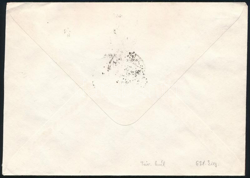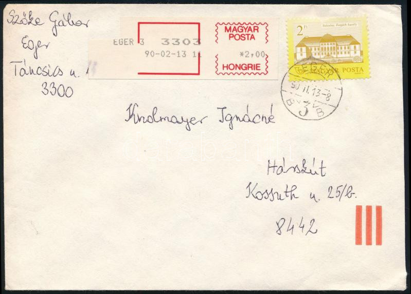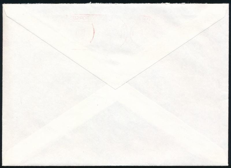 1990 Levél számítógépes felvevő munkahely provizórikus bérmentesítési jegyével, bélyeges díjkiegészítéssel; az "R" betűt kivágták, és így normál levél bérmentesítésére használták / Cover with auxiliary registered label, sent as
