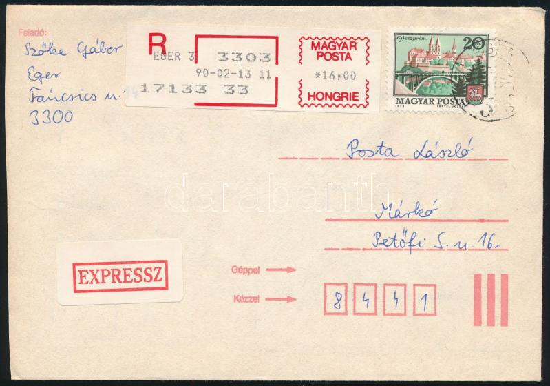 1990 Expressz ajánlott levél számítógépes felvevő munkahely provizórikus bérmentesítési jegyével, bélyeges díjkiegészítéssel / Express registered cover with auxiliary label (Image)(Image 1)