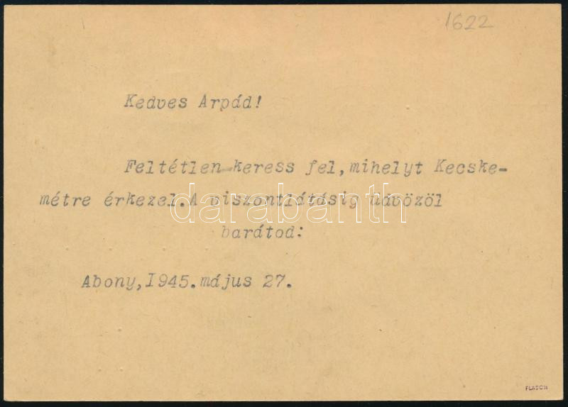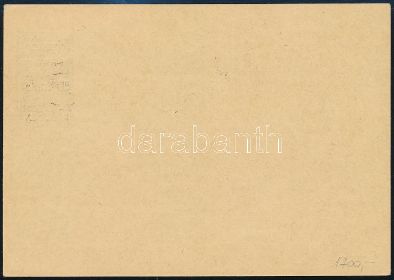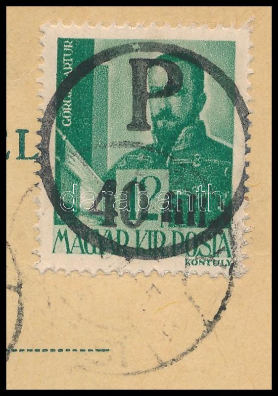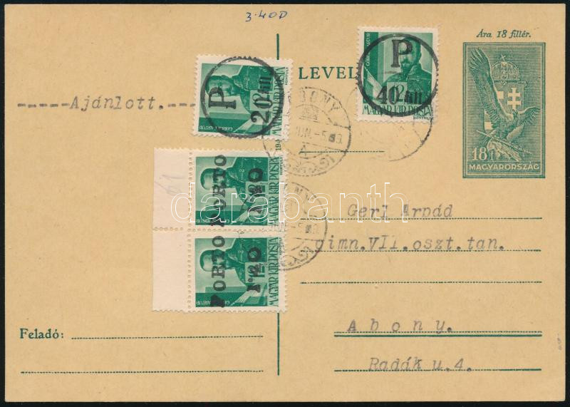 / Local issue Abony, registered local postcard with postage due 20f/12f, 40f/12f, 2 x 1,40P/12f. Original from the legacy of postmaster Molnár - the maker of the overprints. Issue of the stamp: 100-200 pcs, a few covers could exist. Certificate: