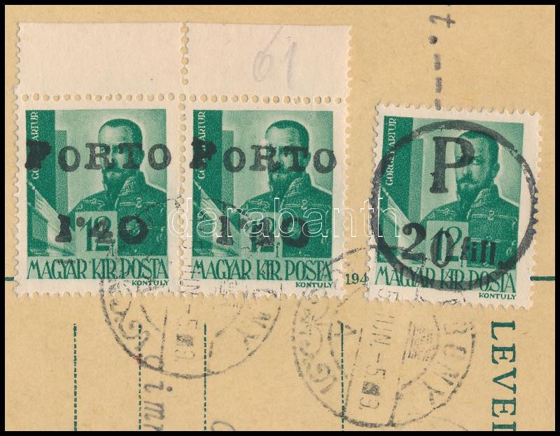 Abony 1945 Portós ajánlott helyi levelezőlap 20f/12f, 40f/12f, 2 x 1,40P/12f portó bélyegekkel, az abonyi felülnyomást készítő Molnár postamester hagyatékából. A bélyegek 100-200 példányban készültek, küldeményen néhány példány létezhet.