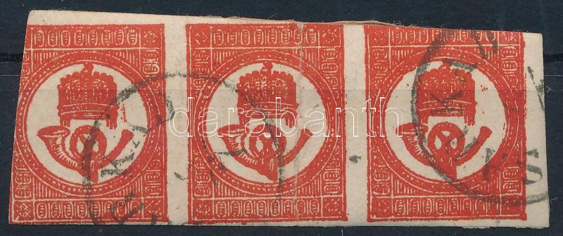 1871 Kőnyomat Hírlapbélyeg hármascsík (törés, több helyen bevágva / fold, cut in several places) (Image)(Image 1)