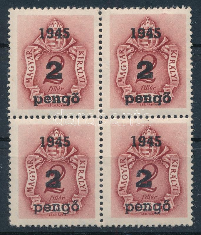 Nagyvárad I. 1945 Barnaportó 2P/2f négyestömb I. és III. típus, egy bélyegen papírránc / block of 4, type I. and III., one stamp with paper crease Signed: Bodor
