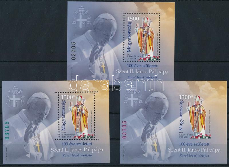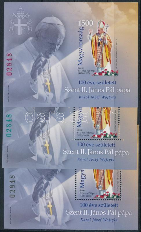 2020 100 éve született Szent II. János Pál pápa normál, túlfogazott és vágott blokk azonos sorszámmal / Mi block 438 AI, AII, B with same number