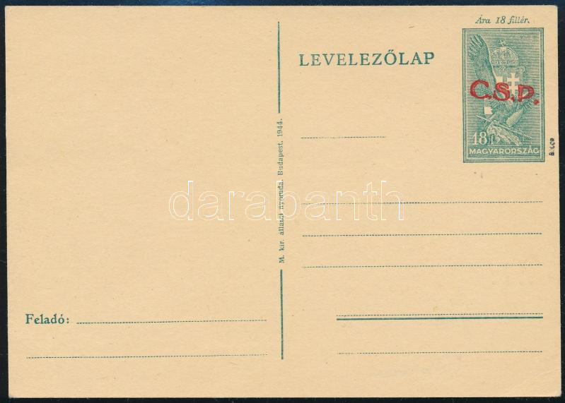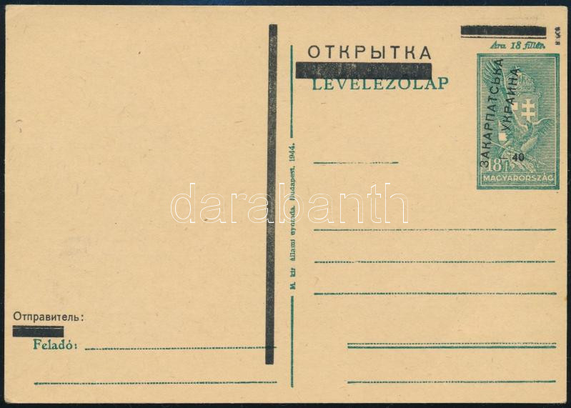 Huszt 1944 18f díjjegyes levelezőlap, használatlan (80.000) / PS-card, unused Signed: Bodor (Image)(Image 1)