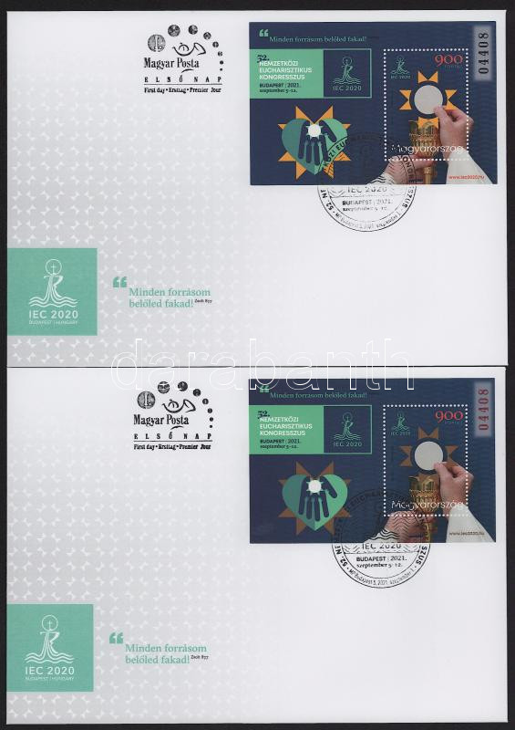 2021 Nemzetközi Eucharisztikus Kongresszus normál és speciális blokkok 1-1 FDC-n, piros és fekete azonos sorszámmal. Nagyon ritka!!! Külön kérésre készült. / Mi block 460 I + II on 2 FDC (Image)(Image 1)