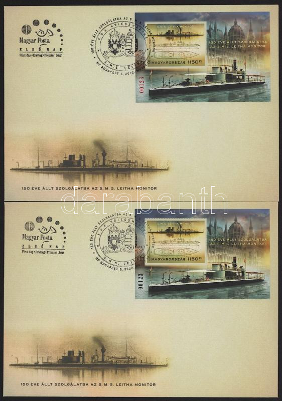 2022 150 éve állt szolgálatba az S.M.S. Leitha monitor normál és vágott blokkok 1-1 FDC-n, piros és fekete azonos sorszámmal. Nagyon ritka!!! Külön kérésre készült. / Mi block 474 A+B on 2 FDC (Image)(Image 1)