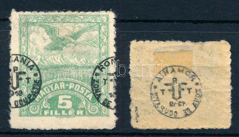 Debrecen II. 1920 5f közönséges papíron látványosan eltolódott felülnyomással + Portó 40f gépszínátnyomattal (foltos / spot), mindkettő Bodor vizsgálójellel