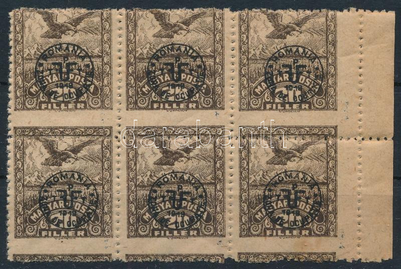 Debrecen II. 1920 20f közönséges papíron ívszéli hatostömbben, elfogazva (foltok) / Mi 83x margin block of 6 with shifted perforation. Signed: Bodor