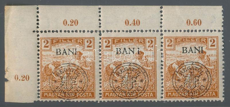 Kolozsvár 1919 Arató 2f ívsarki hármascsík, a második bélyeg "hosszú I betű" lemezhibával. Dr. Szalai monográfiája szerint kb 60 példány létezhet. Rendkívüli ritkaság! / Mi 26 I. corner stripe of 3, with "BAN I" plate variety, may be
