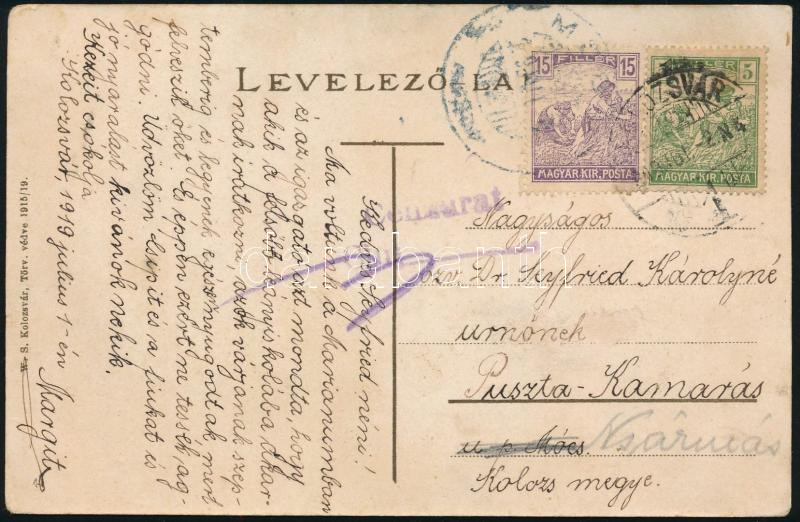 1919 Képeslap cenzúrával és román bélyegekkel Kolozsvárról / Censored postcard with Romanian stamps (Image)(Image 1)
