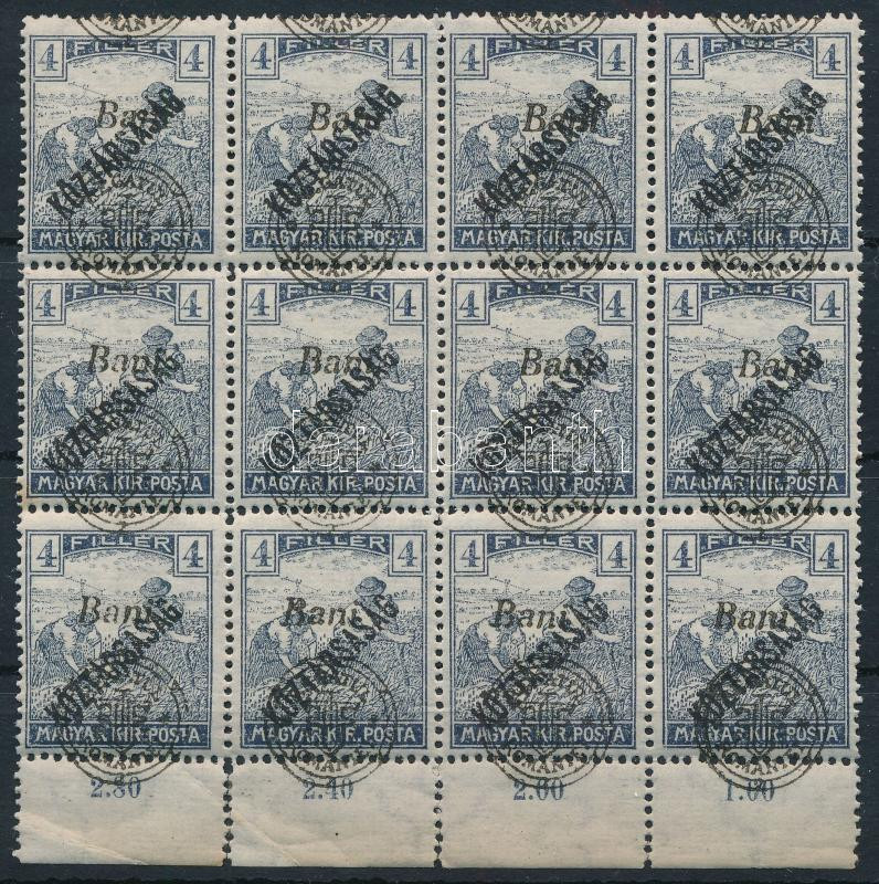 Nagyvárad 1919 Arató/Köztársaság 4f ívszéli 12-es tömb elcsúszott felülnyomással (rozsda, saroktörés) / margin block of 12 with shifted overprint (stain, folded corner) Signed: Bodor (Image)(Image 1)