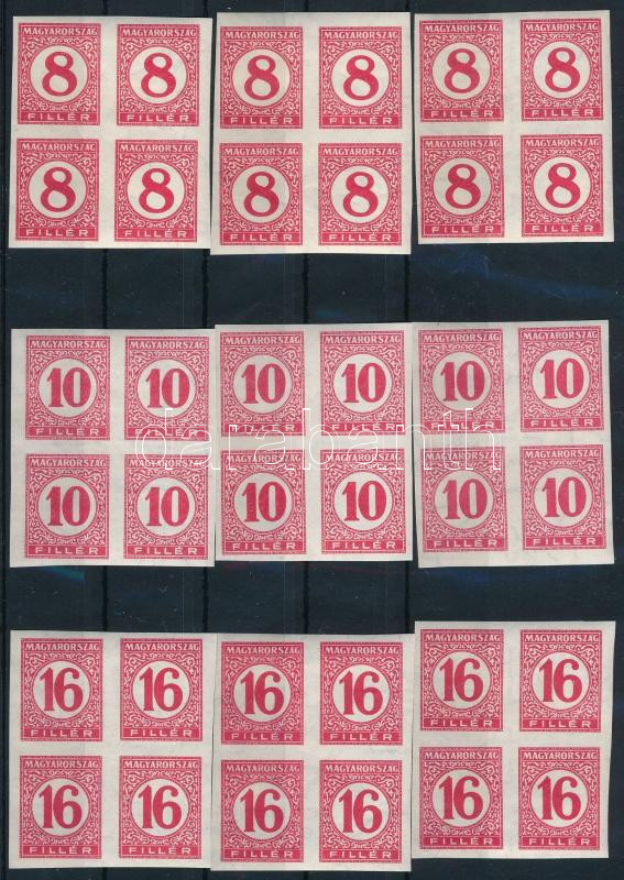Pengő-filléres portó (II.)3 db 3 értékes vágott négyestömb sor vékony papíron (csak ez a 3 érték került kiadásra vékony papíron) (180.000) / 3 x Mi 113-115 imperforate blocks of 4 on thin paper (only these 3 values exist on thin paper) (az egyik 10f